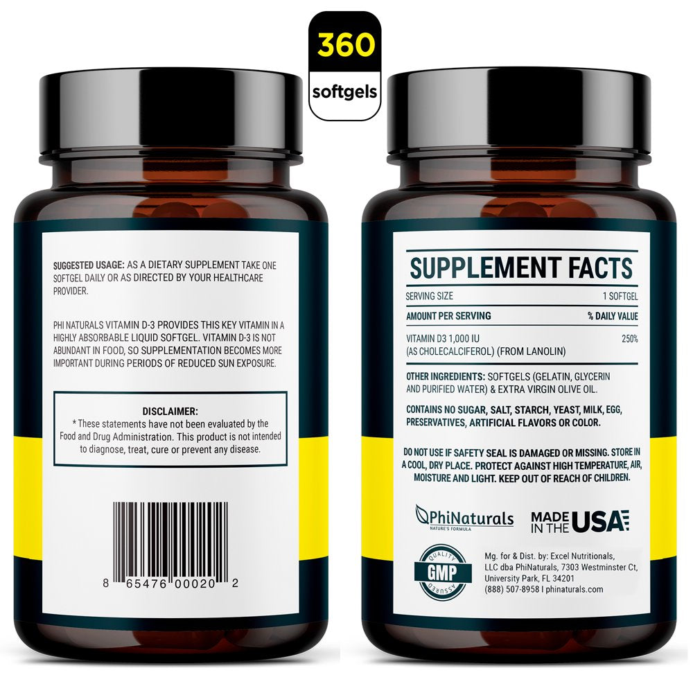 Phi Naturals Vitamin D3 1000 IU Softgels, 360