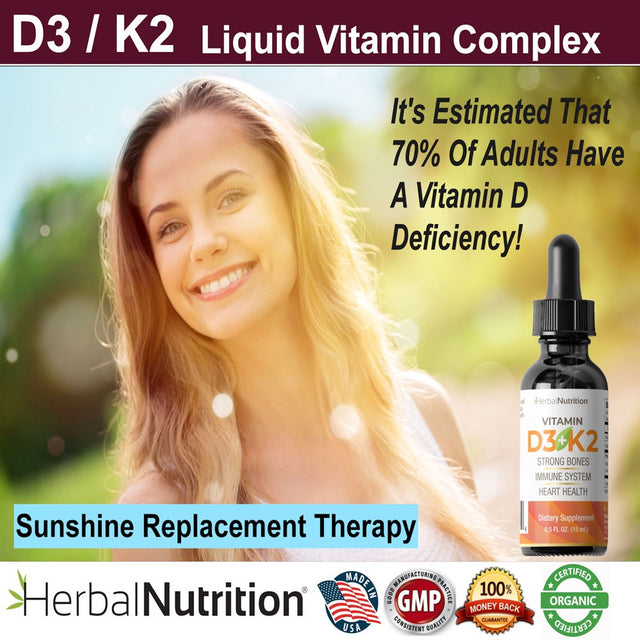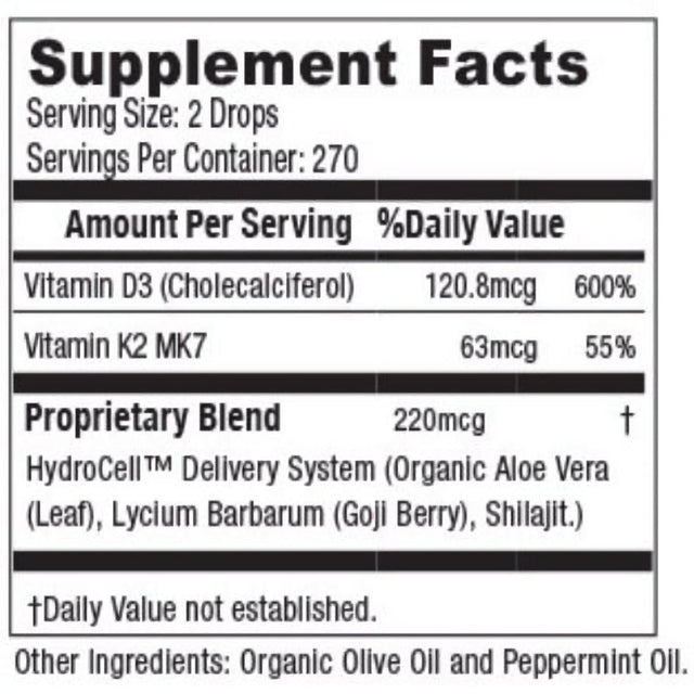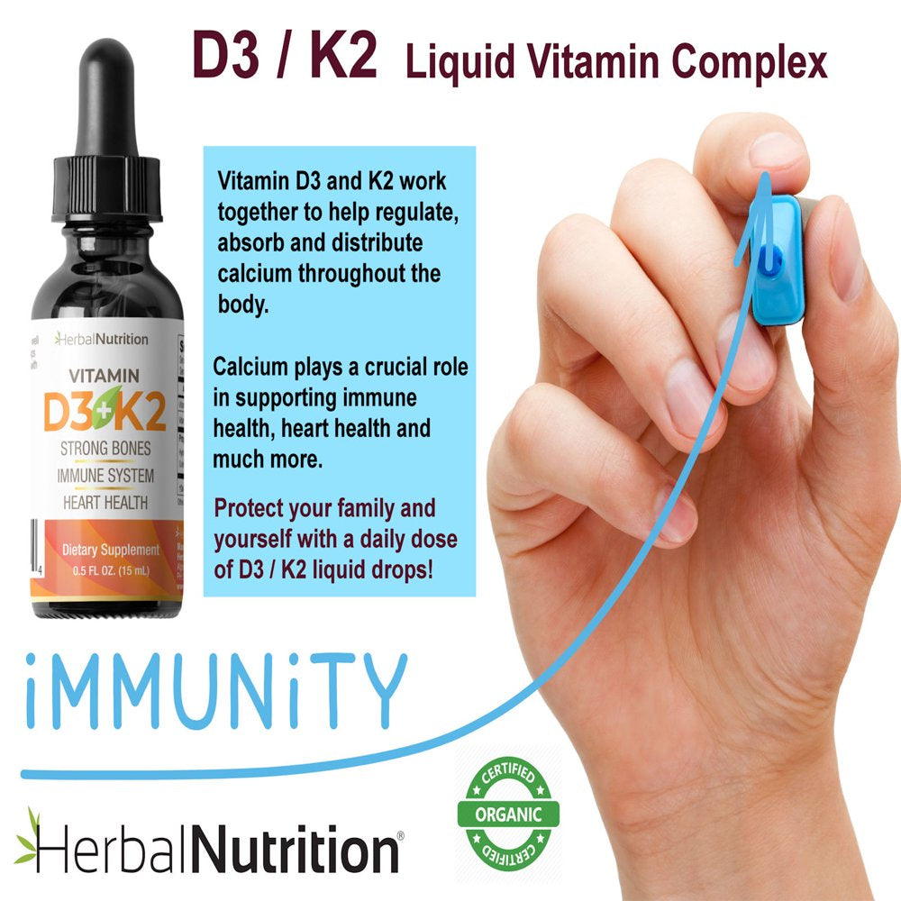 Organic Vitamin D3 / K2 Liquid Vitamin Complex from Herbal Nutrition, supports strong bones, regulates calcium, promotes cardiovascular and immune system health and aids muscle function. Maximum strength 120.8mcg (5000iu) Vitamin D3, 63mcg Vitamin K2 (MK7) Vitamin D3 (MK7) is the natural form of Vitamin D that the body makes from sunlight. Vitamins D3 and K2 each function more effectively in the presence of the other. Hydrocell Delivery System for Superior Absorption! Hydrocell enhances the absorption and effectiveness of nutrients and provides superior uptake and bioavailability. Made In USA. Our Formula will help build Strong Bones, Boost Immune & Cardiovascular Health, Aid in Muscle Function and Replace Sunlight! Peppermint Flavor! 270 Servings from Herbal Nutrition.