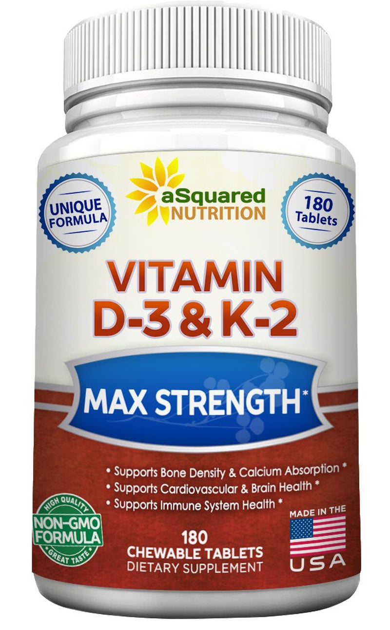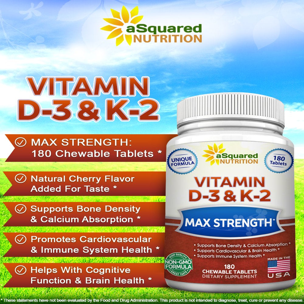 Vitamin D3 with K2 Supplement - 180 Chewable Tablets, Max Strength D-3 Cholecalciferol & K-2 MK7 to Support Healthy Bones, Teeth, Heart - Antioxidant D 3 & K 2 MK-7 Energy Formula for Men and Women