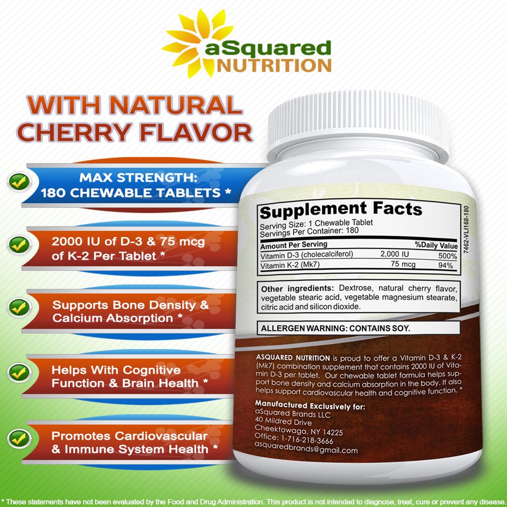 MAXIMUM STRENGTH VITAMIN D-3 & K-2 SUPPLEMENT PROVIDING 180 CHEWABLE CHERRY-FLAVORED TABLETS IN EACH BOTTLE WITH 2000 IU OF D3 & 75 MCG OF K2 PACKED INTO EACH TABLET. *