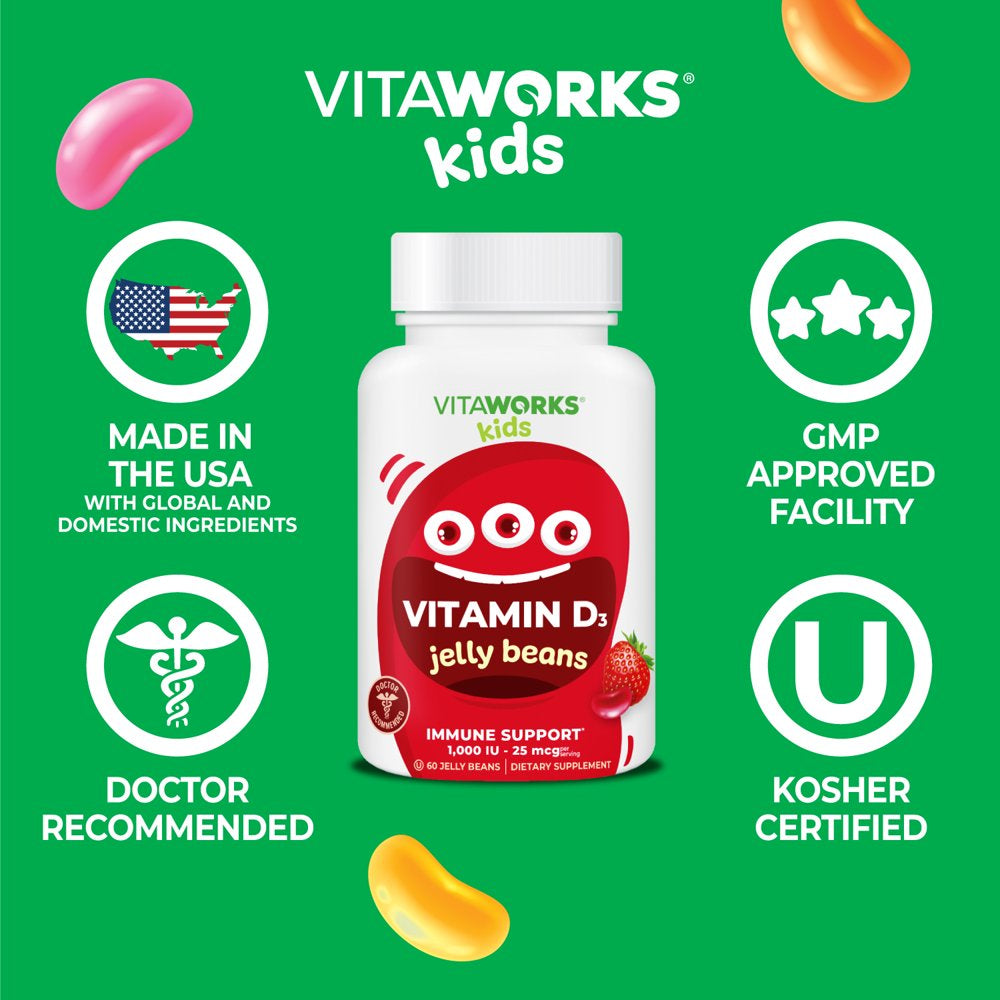 Vitaworks Kids Vitamin D 1000 IU Jelly Beans, Dietary Supplement for Immune Support, 60 Jellies