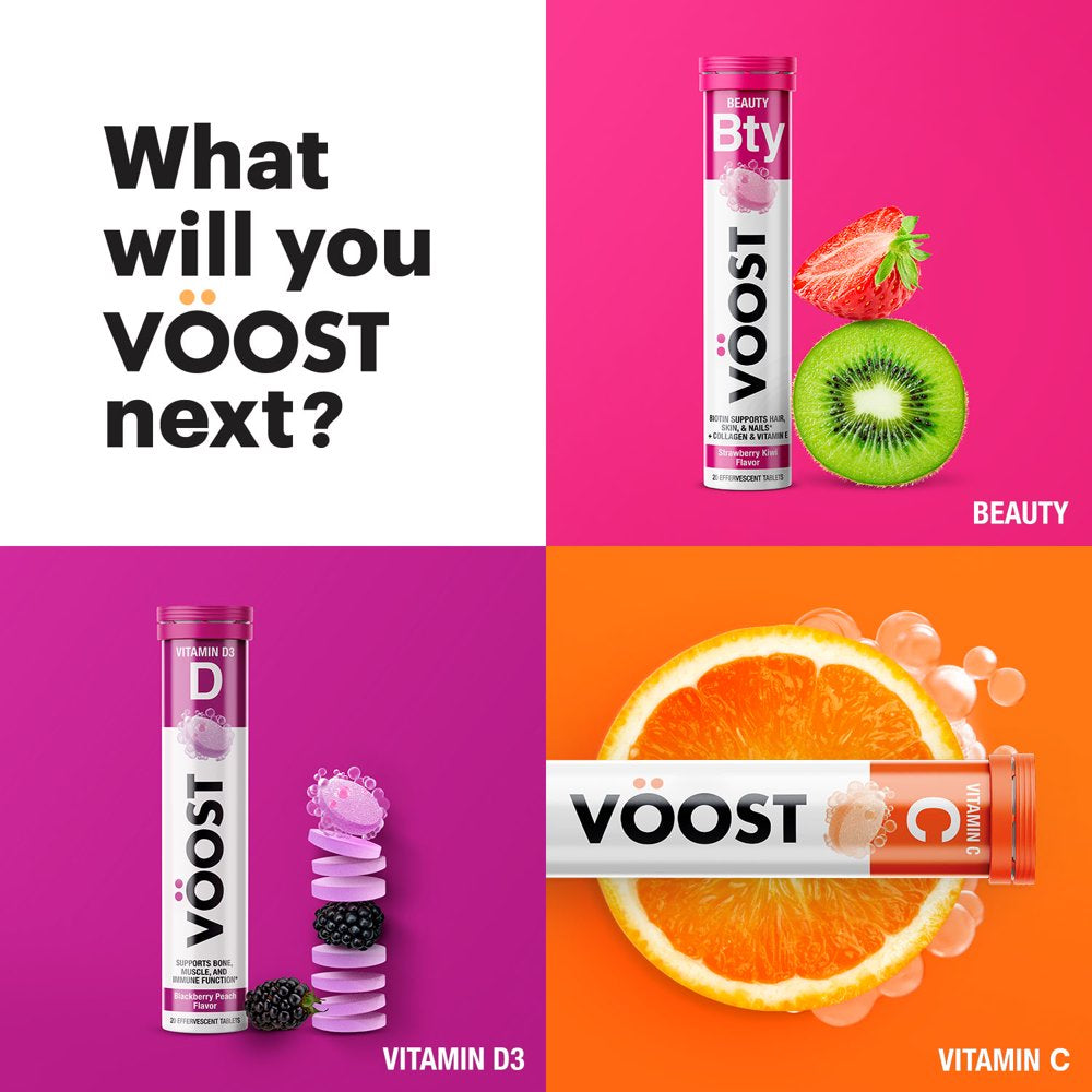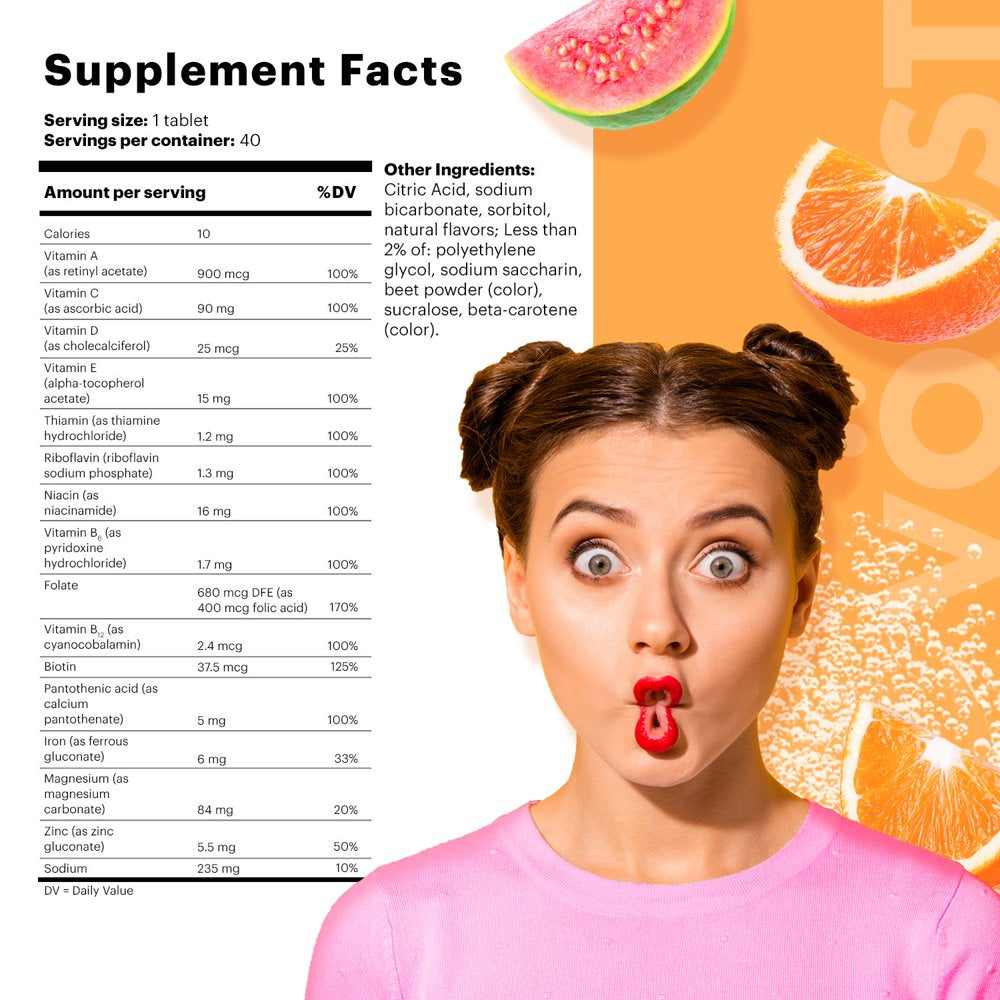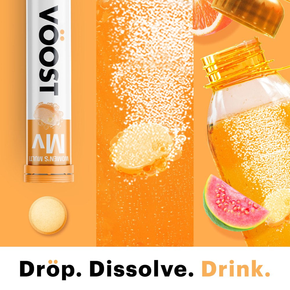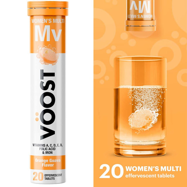 VOOST, Multivitamin for Women, with Vitamin A, C, D, E, B, Folic Acid, and Iron, Daily Women's Multivitamin, Effervescent Supplement, Low Calorie Vitamin Tablet, Orange Guava Flavor. There's taking vitamins. Then there's experiencing VOOST Women's Multivitamin. The fizzing amazing way to give your body the nutrients it needs for daily health*. This extraordinary multivitamin for women is packed with B Complex, Folate, Iron, Vitamin C and 8+ essential vitamins and minerals so you can slay your day. Think women's multivitamin gummies are yummy? Wait until you taste the oh-ya-orange flavor of a VOOST Women's Multivitamin effervescent tablet. Just pop a tablet into your fave water vessel and watch the bubbly transformation of plain water into an Orange Guava vitamin drink supplement. Wanna amp up the flavor? Mix the dissolvable tablet with 8 ounces of water. More of a flavor lightweight? Mix it with 16 ounces instead. No matter how, when, or where you enjoy this sugar-free and low-calorie fizzy drink mix, VOOST makes your day more amazeballs. Subscribe now and never miss out on your effizzing amazing VOOST vitamins. *These statements have not been evaluated by the Food and Drug Administration. This product is not intended to diagnose, treat, cure, or prevent any disease.