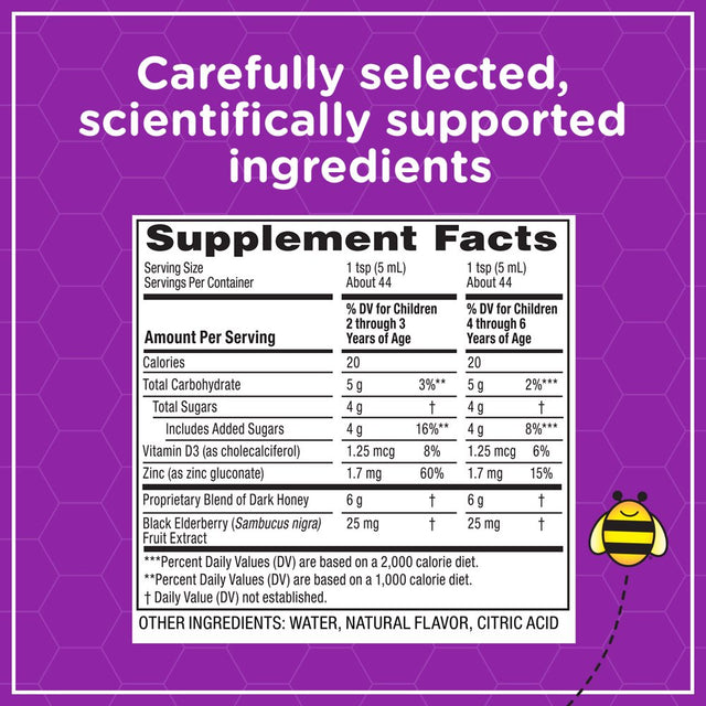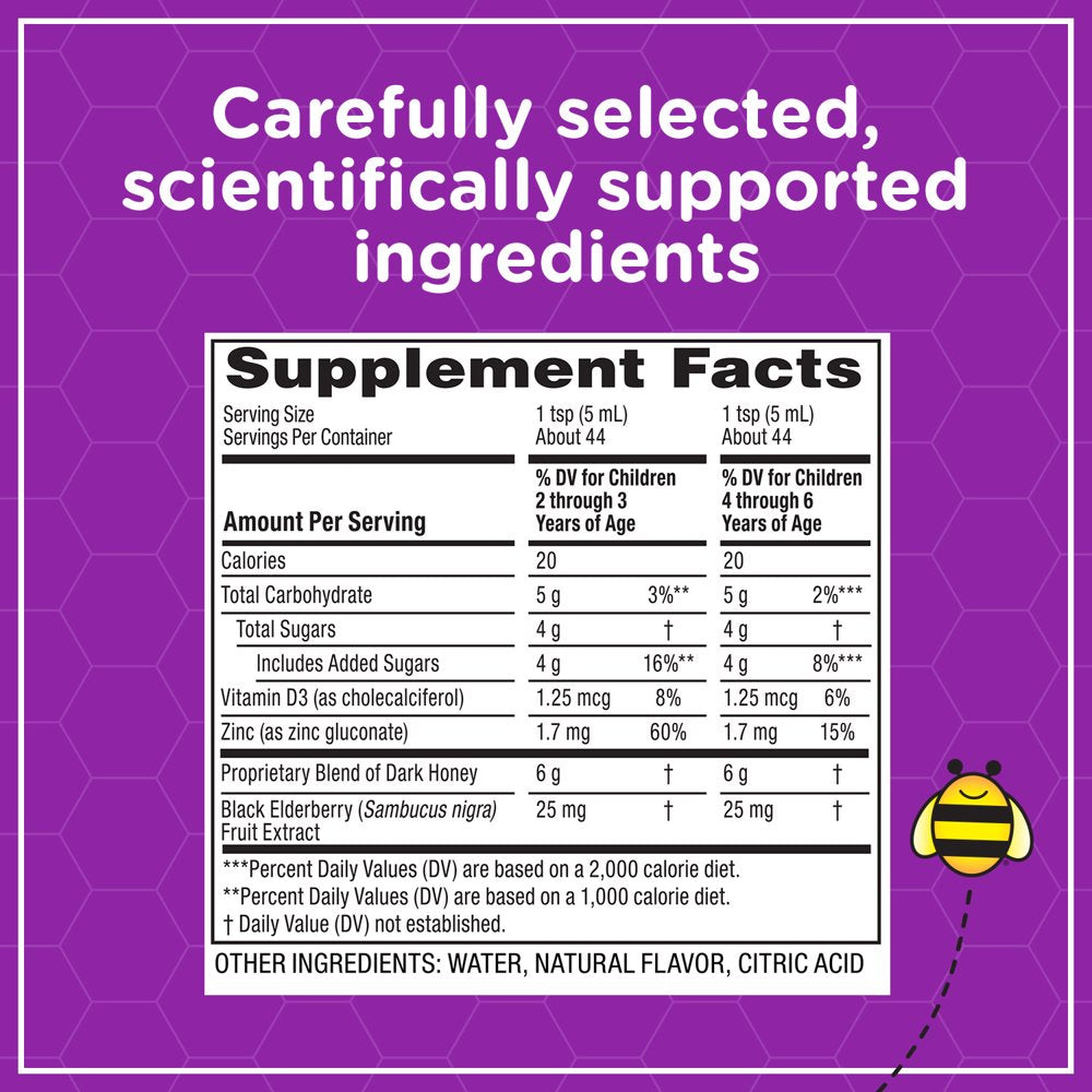 Zarbee’s Kids Cough + Immune Syrup Daytime is specifically tailored for children 2-6 with carefully selected and scientifically supported ingredients like dark honey, proven to soothe coughs, and vitamin D Zinc and elderberry extract to support the body’s natural immune system*. Naturally sweetened, the only sugar in our bottles comes from our soothing dark honey, kids will love the natural mixed berry flavor. From the #1 Pediatrician Recommended Cough Syrup brand, Zarbee’s cough syrups are a safe and effective way to calm coughs associated with hoarseness and irritants. Free of drugs, alcohol, artificial sweeteners, added flavors or dyes, or high fructose corn syrup. Allergen-Friendly: Gluten, dairy, egg, and peanut free. *These statements have not been evaluated by the Food and Drug Administration. This product is not intended to diagnose, treat, cure, or prevent any disease.