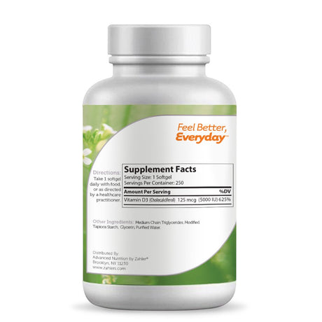 Vitamin D3, Advanced D3 Formula, 125 Mcg (5,000 IU), 250 Softgels, Zahler