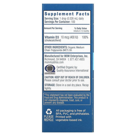 Vitamin D, Organic Drops, Newborn +, 0.11 Fl Oz (3.24 Ml), Mommy'S Bliss