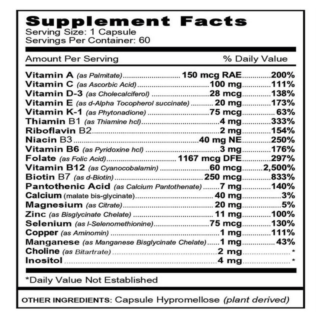 Vitamin A (Retinyl Palmitate); Vitamin B-1 (Thiamine HCI); Vitamn B-2 (Riboflavin); Vitamin B-3 (Niacinamide); Vitamin B-5 (d-Calcium Pantothenate); Vitamin B-6 (Pyridoxine HCI); Vitamin B-12 (Cyanocobalamin); Vitamin C (Ascorbic Acid); Vitamin D3 (Cholecalciferol); Vitamin E (d-Alpha Tocopheryl Succinate); Biotin; Folate (Folic Acid); Choline (Bitartrate); Inositol; Calcium (malate bis-glycinate); Magnesium (Amino Acid Chelate); Zinc (Citrate); Manganese (Citrate); Copper (Citrate); Selenium (I- Selenomethionine)/div>