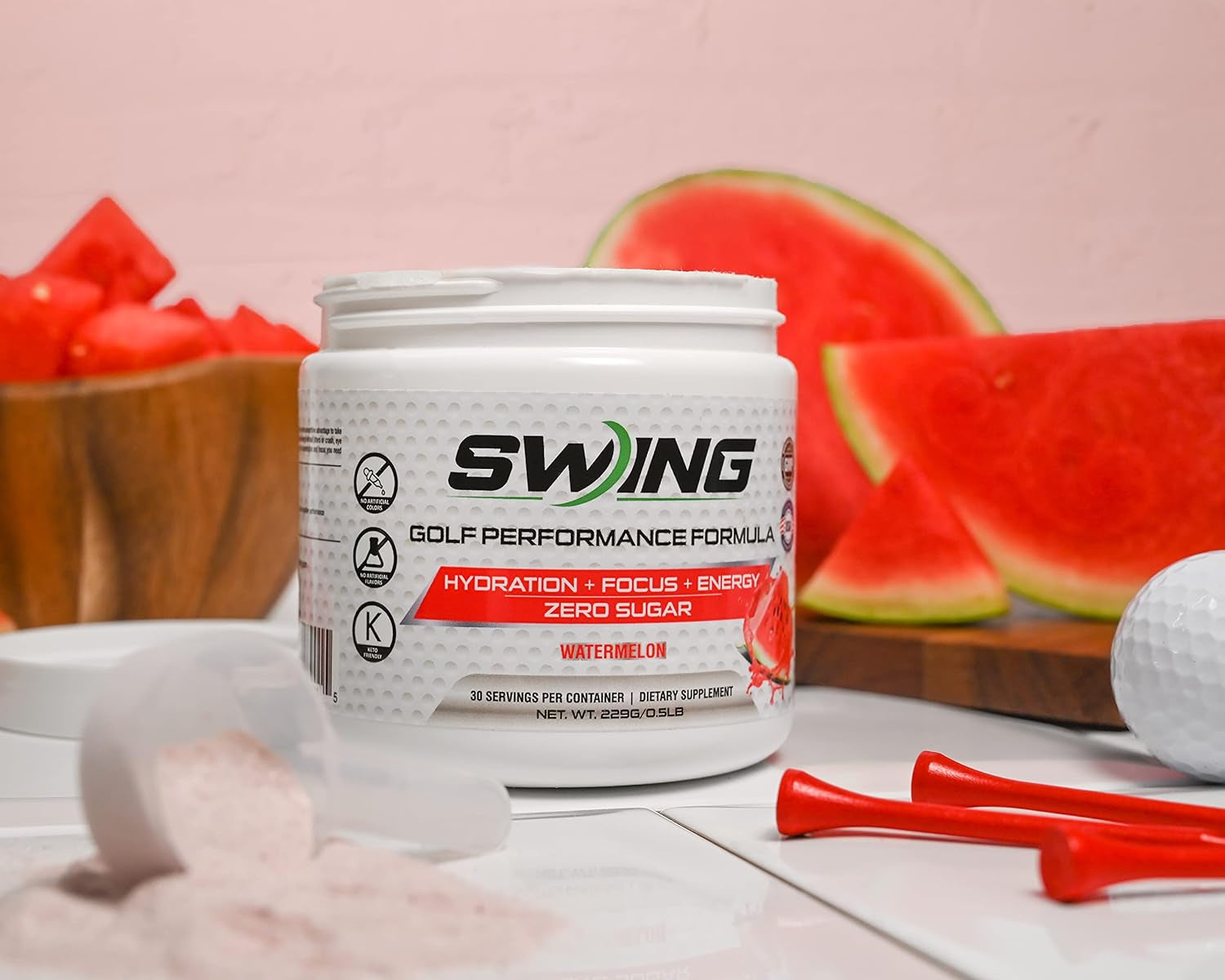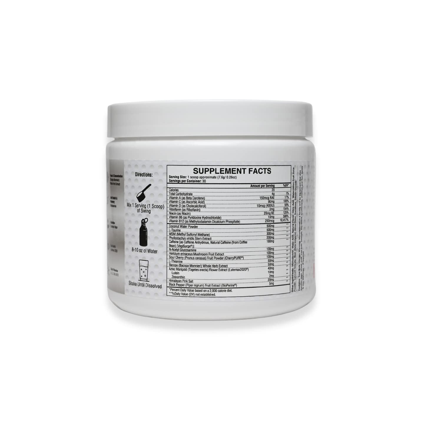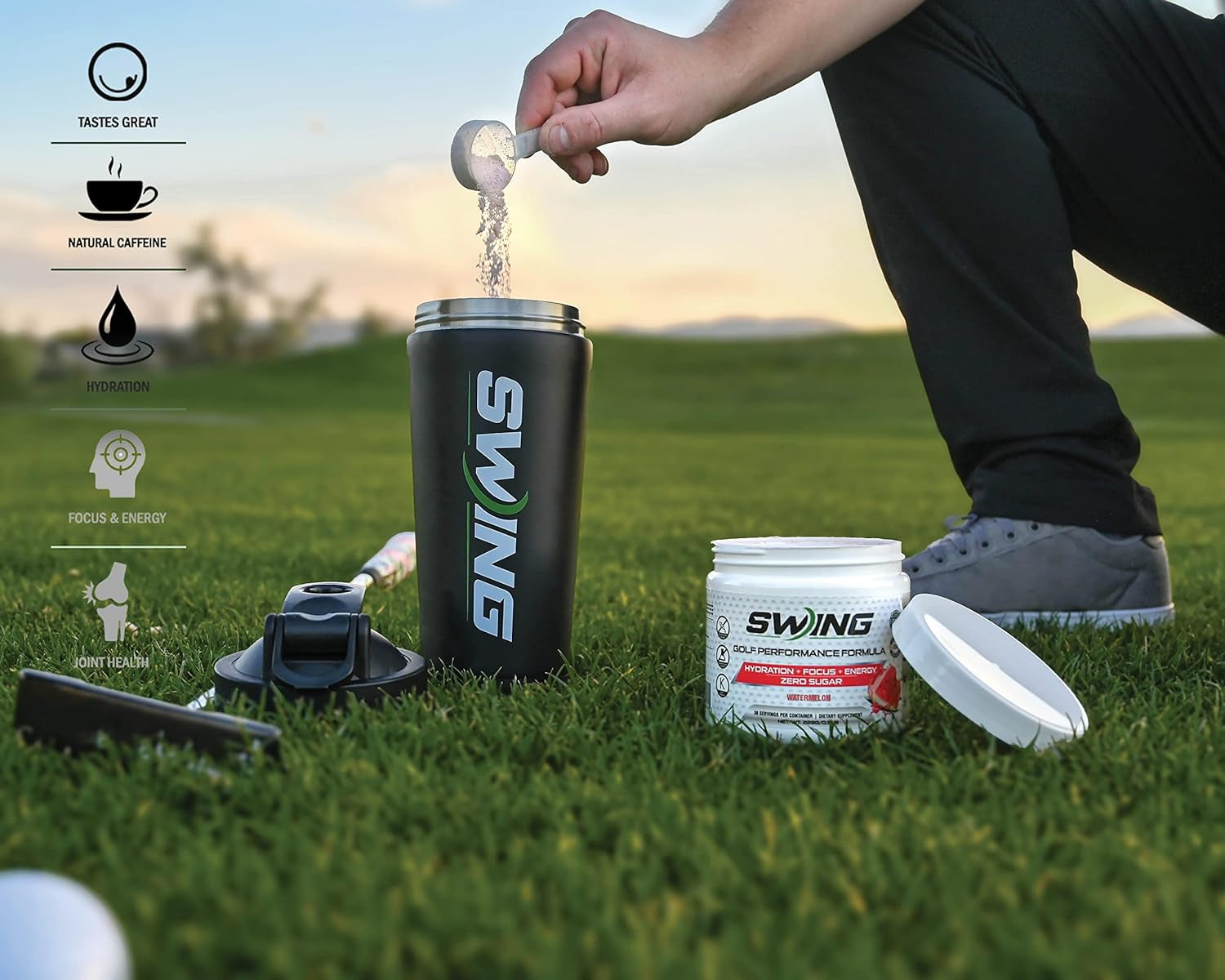 SWING is a great tasting, sugar free energy drink, specifically designed to increase your focus and concentration. One serving of SWING has 180mg of natural caffeine and full panel of multivitamins, including A, C, D, B6 and B12, Glucoasamine for joint health, pink Himalayan sea salt for hydration and Lutemax2020 for eye health and protection from sun exposure. SWING is the ONLY energy drink on the market that will give you the focus and concentration needed to play your best.