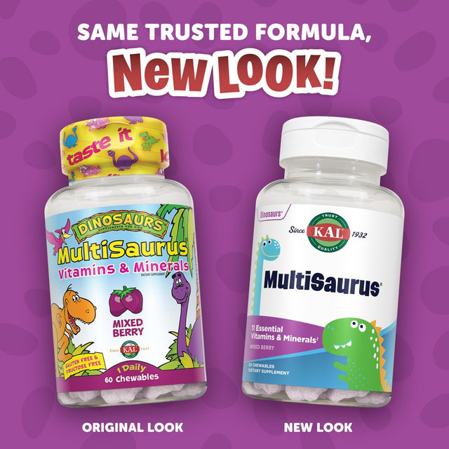 Ever worry that your children arent getting all the nutrition they need? With KAL MultiSaurus Vitamins & Minerals for Kids, your worries are extinct! Each deliciously nutritious chewable provides a full spectrum of essential vitamins and minerals along with whole foods like broccoli, carrots, and tomatoes. While kids love our mixed berry flavor dinosaur-shaped chewables, parents love that MultiSaurus Vitamins & Minerals contains natural flavors and colors, no artificial preservatives, no fructose, and xylitol for healthy little chompers!