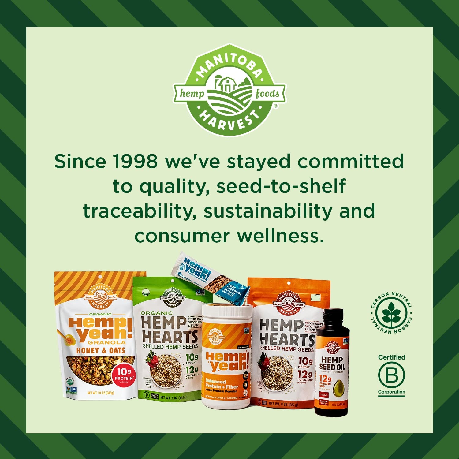 - QUALITY FROM SEED TO SHELF: Manitoba Harvest takes only the freshest, highest quality hemp seeds from field to table. Since 1998, we’ve grown our portfolio of hemp products with a dedication to quality, sustainability, and consumer wellness as a global leader in hemp foods.