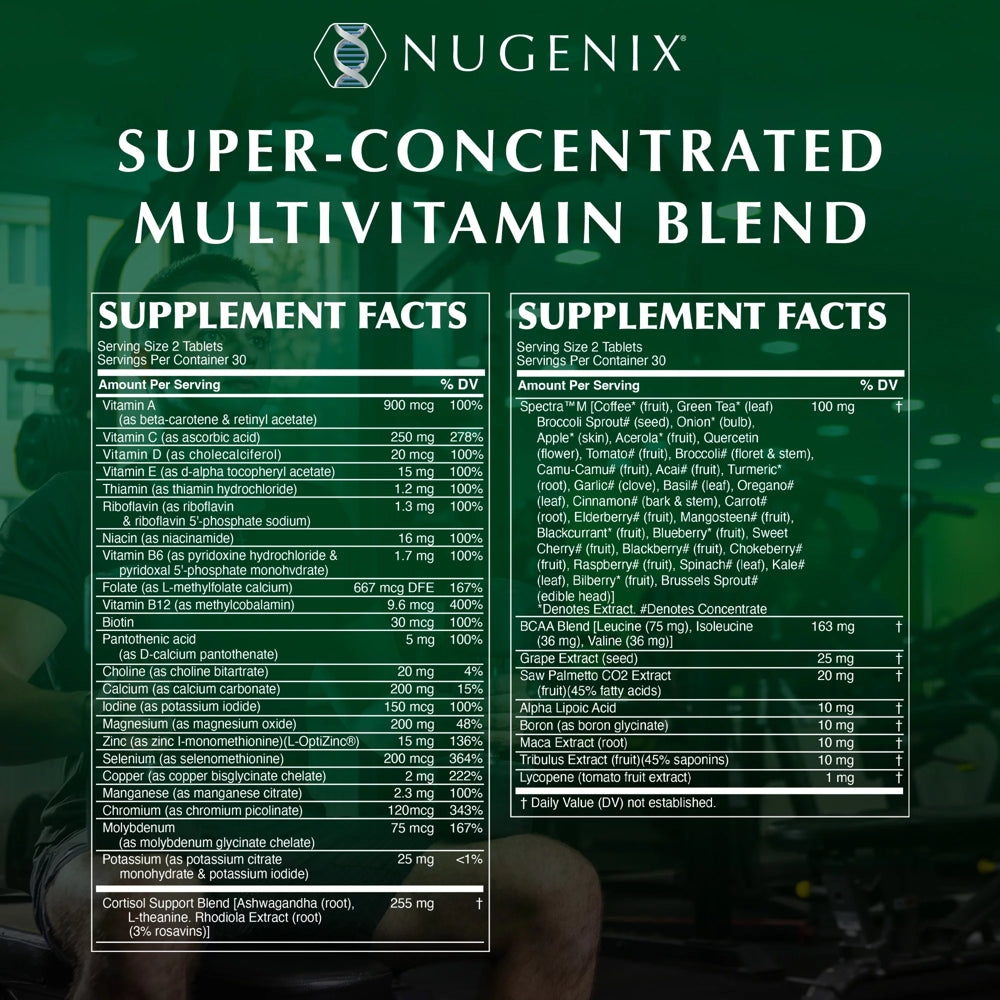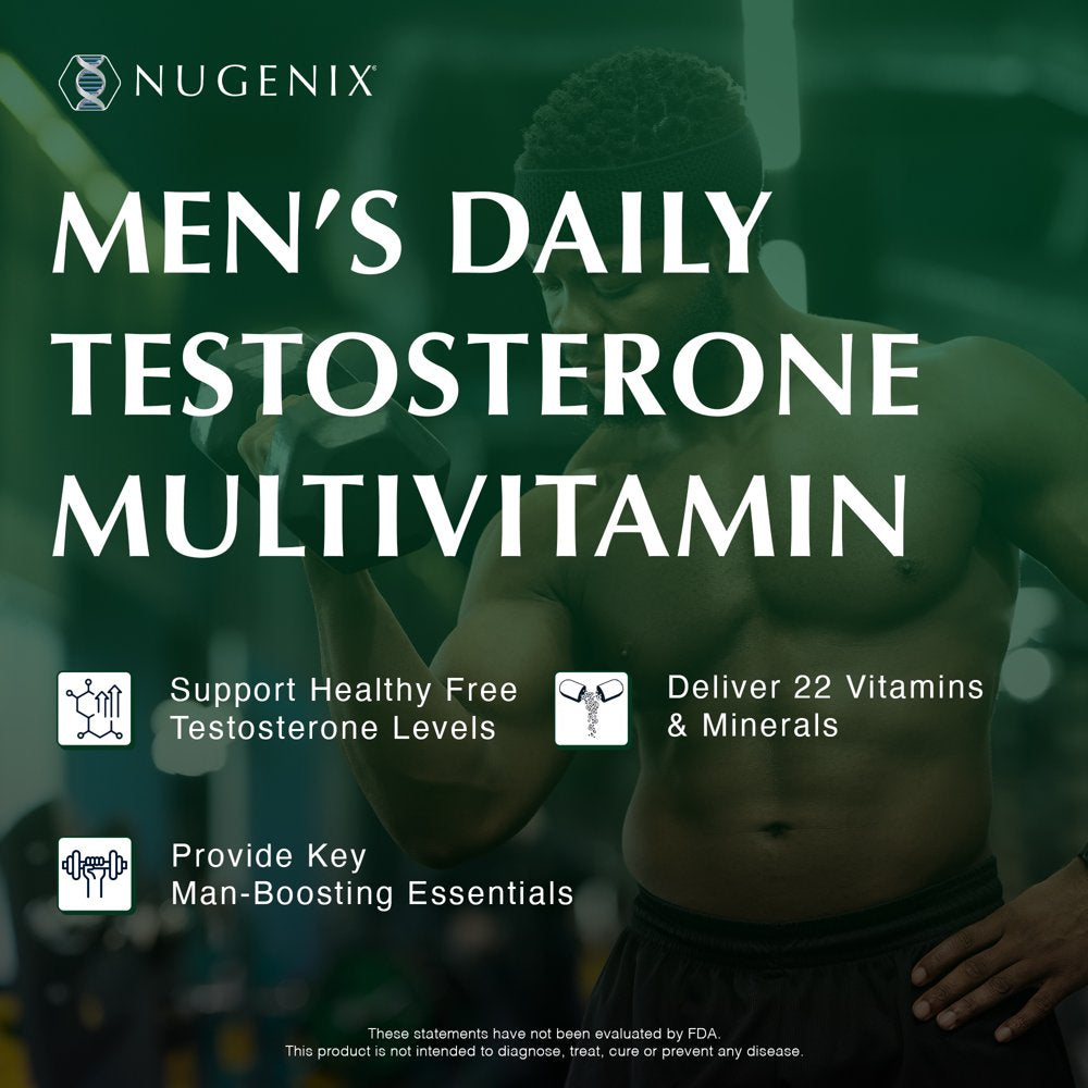 Nugenix Men's Daily Testosterone Multivitamin is a super-concentrated formula specifically designed to provide a rock-solid foundation for all other Nugenix products. Nugenix Multivitamin contains 19 high-potency vitamins and minerals that meet or exceed 100% daily value, including 4 bioactive forms of B vitamins. Unlike other multivitamins, this formula supports men’s vitality in 3 powerful ways: 1) a bioavailable dose of boron to help support healthy free testosterone levels, 2) a blend to help balance cortisol, and 3) Spectra to promote the bioavailability of nitric oxide to support blood flow & physical response. Stack Nugenix Multivitamin with any other product in the line for optimal male benefits. Nugenix also recommends: Nugenix Free Testosterone Booster; Nugenix Ultimate Testosterone.