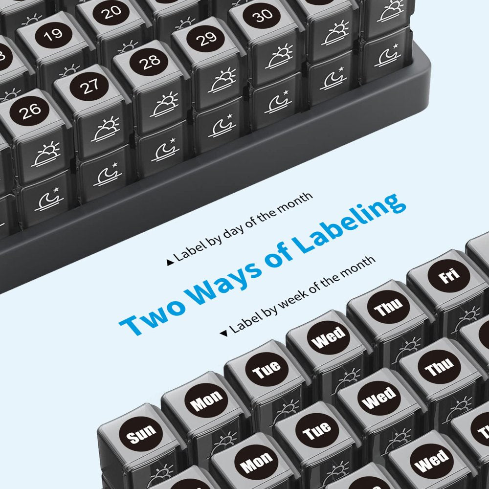 Store Your Monthly Pills: Still sorting your pills daily or weekly? Why don’t you choose this monthly AM/PM pill organizer? This pill organizer has 32 individual compartments, you can sort and fill your pills for a month at once!! Whether you take your pills by day or by week, this pill dispenser can meet all your needs as you can get 2 types of stickers, you can number your boxes as you like!
