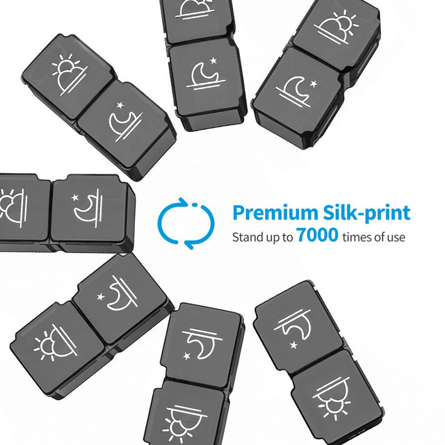 BPA-Free: Made of high-quality food-grade materials and designed with premium silk-print, no need to worry about the icons will fade away, 7000 times of use proved! The translucent lid makes it easier to check your medications and the colorful boxes will remind you of your pills!!