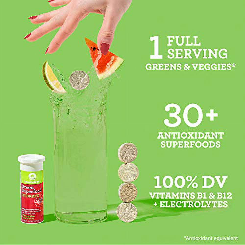 Flavor:Hydrating Watermelon Lime | Size:30 Count Our Green Superfood Effervescent Hydrate Watermelon Lime blend thoughtfully combines our alkalizing farm fresh greens and over 30 antioxidant superfoods plus electrolytes and vitamins in a convenient effervescent tablet. Drop one tab into 8-10 fl oz of water for a refreshing way to feel amazing every day.