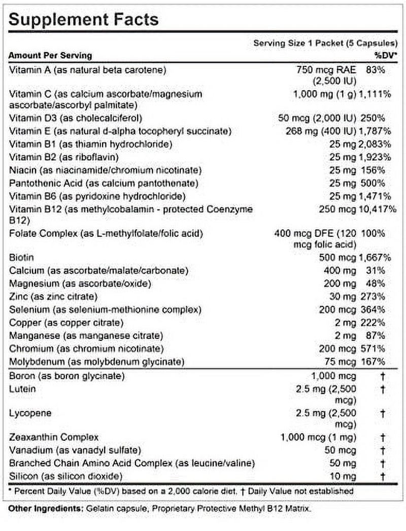 - SUPERIOR 100% PURE BIO-ACTIVE INGREDIENTS Provides high potencies of all essential vitamins, minerals and carotenoids, including Vitamin A, vitamin C, Vitamin D3, Vitamin E, B-complex vitamins, Calcium, Magnesium, Zinc, Selenium, Copper, Manganese, Chromium, Molybdenum, Boron, Vanadium, Silicon, Lutein, Lycopene, Zeaxanthin and Branched Chain Amino Acid. Contains NO Milk / Dairy-Free, Gluten-Free; NO Additives or Common Allergens of Any Kind.