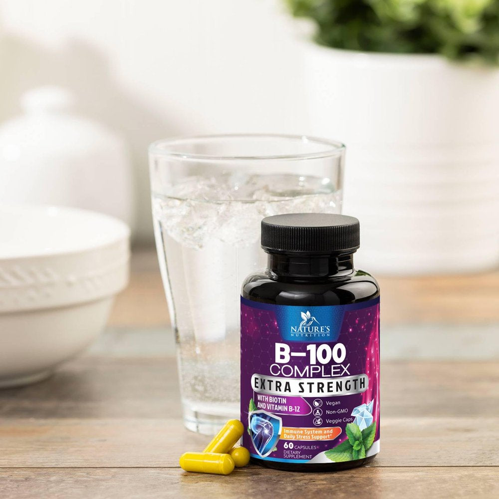 - Vitamin B Complex Capsules by Nature's Nutrition: B Complex Vitamins for women and men, b 100 supplement with b12, b6, b1, b3 plus more, high potency b-complex supplements made with vit c plus energy support bcomplex nature natures best b-100 b100 folic acid vitamina b complejo para mujer y hombres