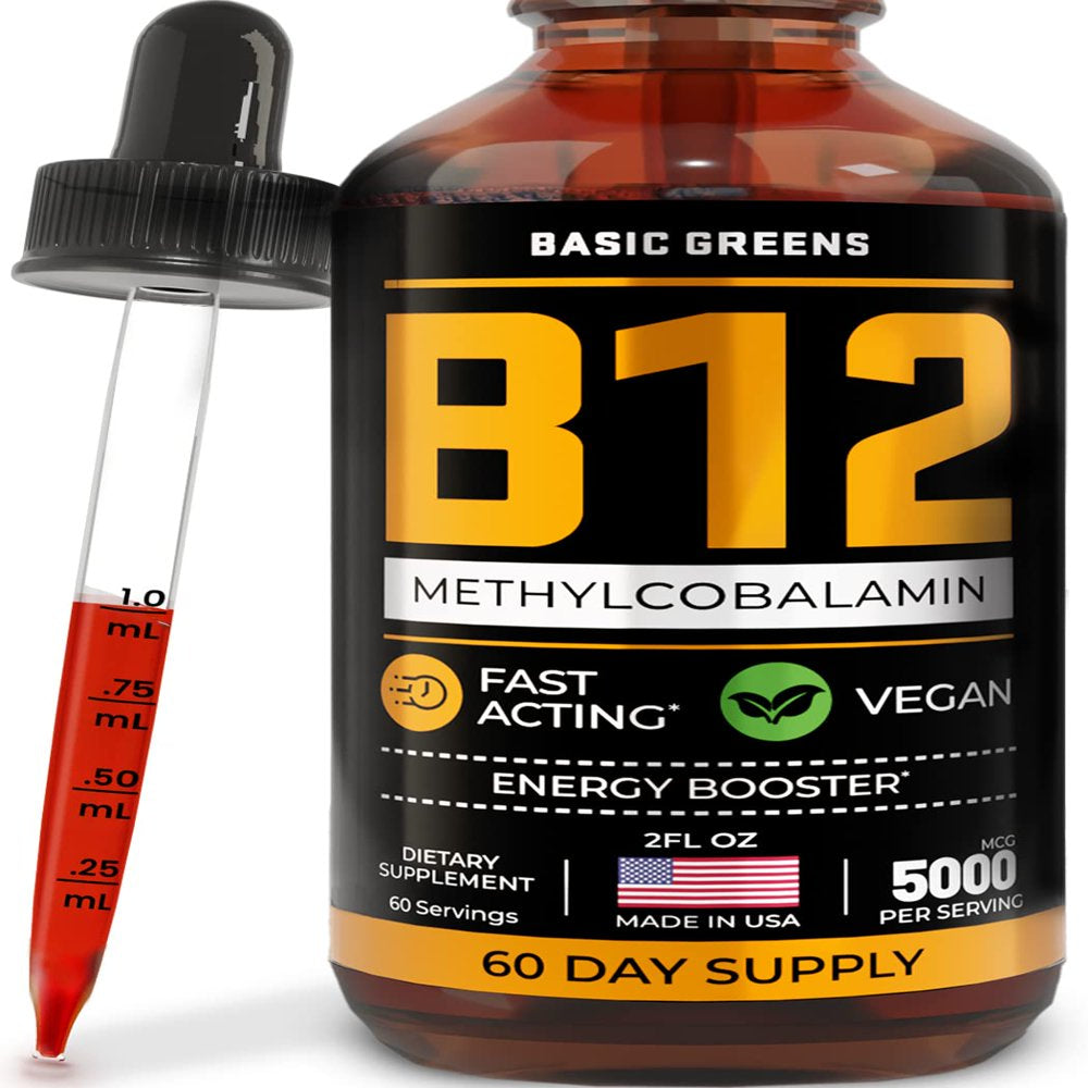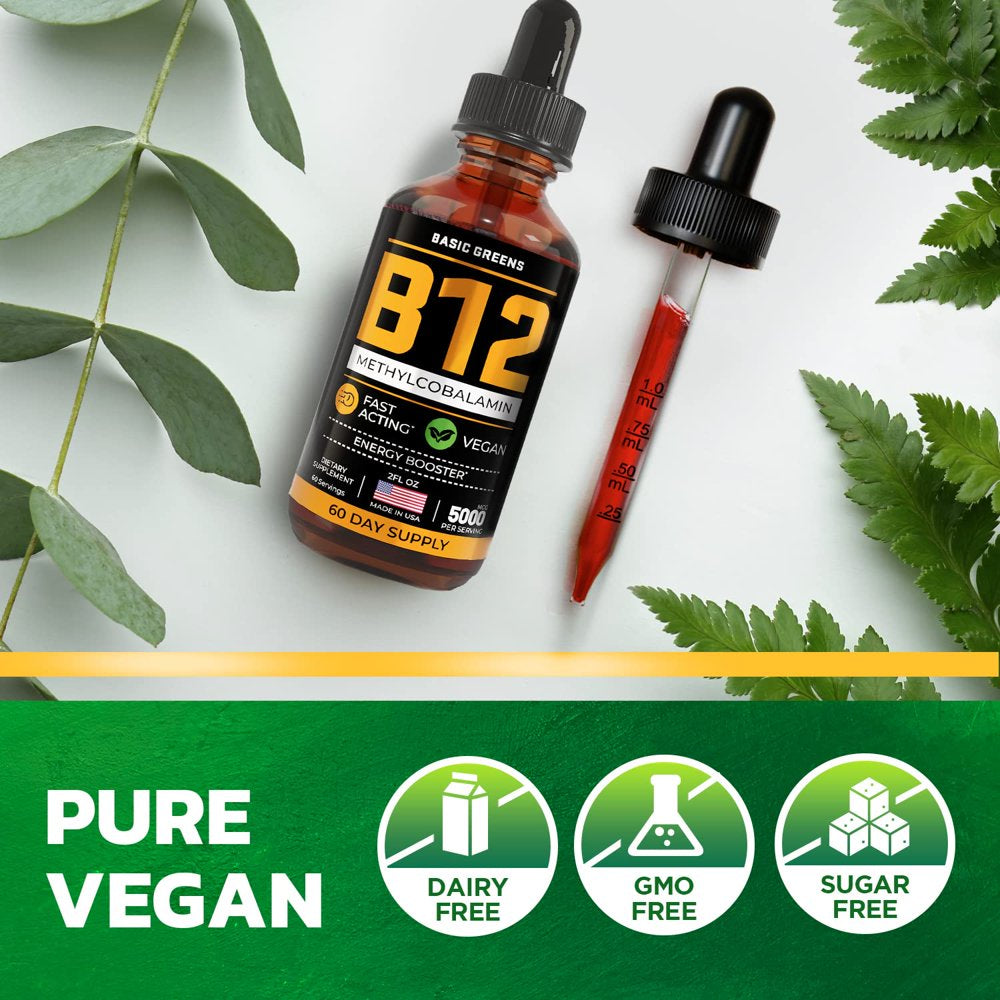 BASIC GREENS Vitamin B12 Sublingual (Vegan) 2 Fl Oz - Methylcobalamin B12 Vitamins 5000 Mcg, B12 Liquid, Liquid B12, B12 Drops, B-12 Vitamin Natural Cherry Flavor is backordered and will ship as soon as it is back in stock.