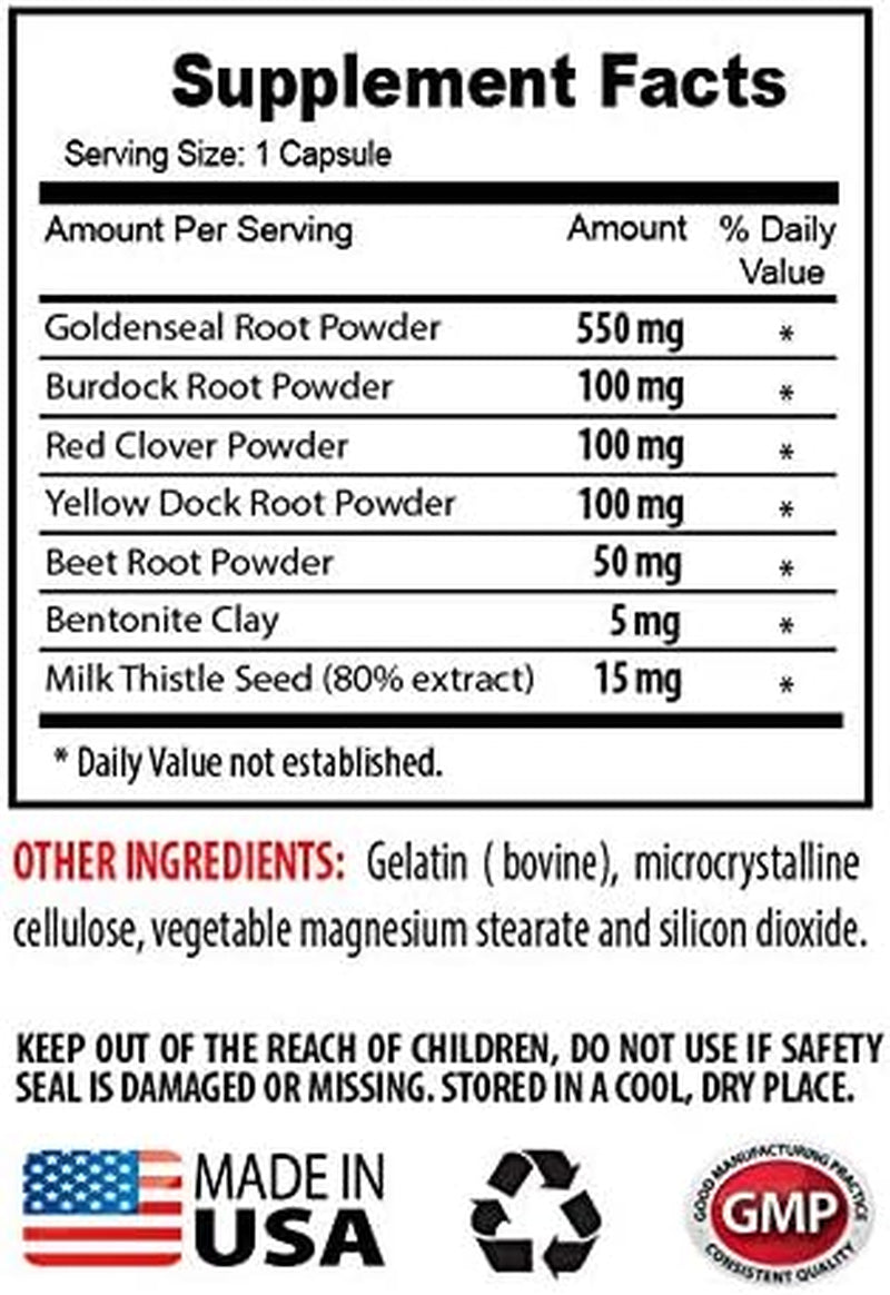 - FULL BODY DETOX AND CLEANSE: Our natural complex can be beneficial for boosting immune system and digestion, support liver and kidney functions, also it have antionxidant properties. This poverful formula contains natural blend from herbs and extracts such as: Goldenseal Root, Burdock Root, Red Clover, Yellow Dock, Beet Root, Bentonine Clay and Milk Thistle Seed (80% extract).