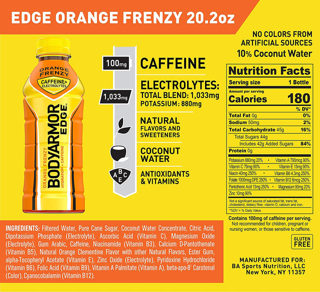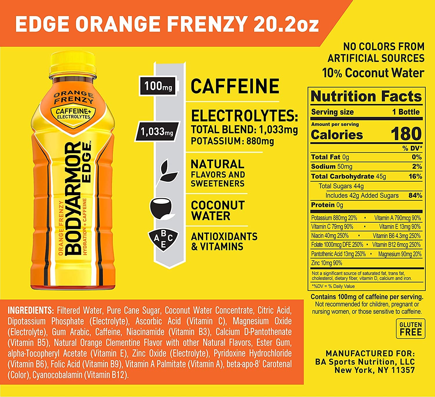 BODYARMOR EDGE Sports Drink with Caffeine, Orange Frenzy, Potassium-Packed Electrolytes, Caffeine Boost, Natural Flavors with Vitamins, Perfect for Athletes 20.2 Fl Oz (Pack of 12) - Orange Frenzy / 20.2 Ounce Pack Of 12 is backordered and will ship as soon as it is back in stock.