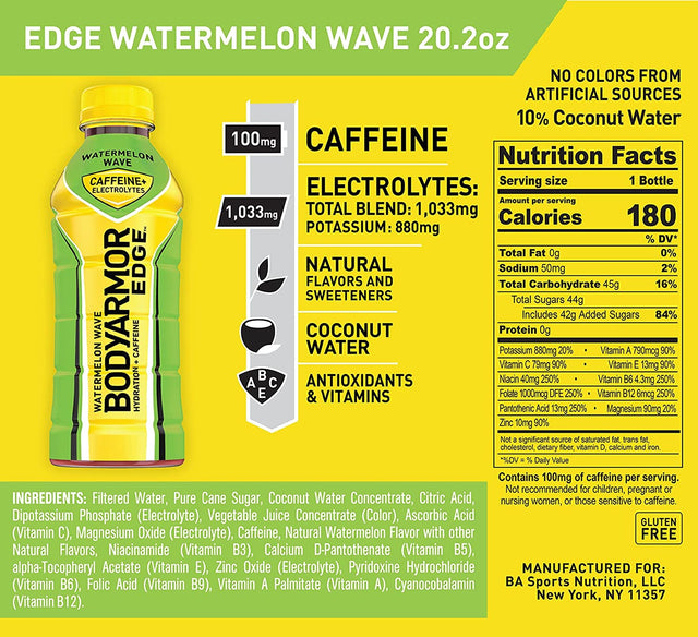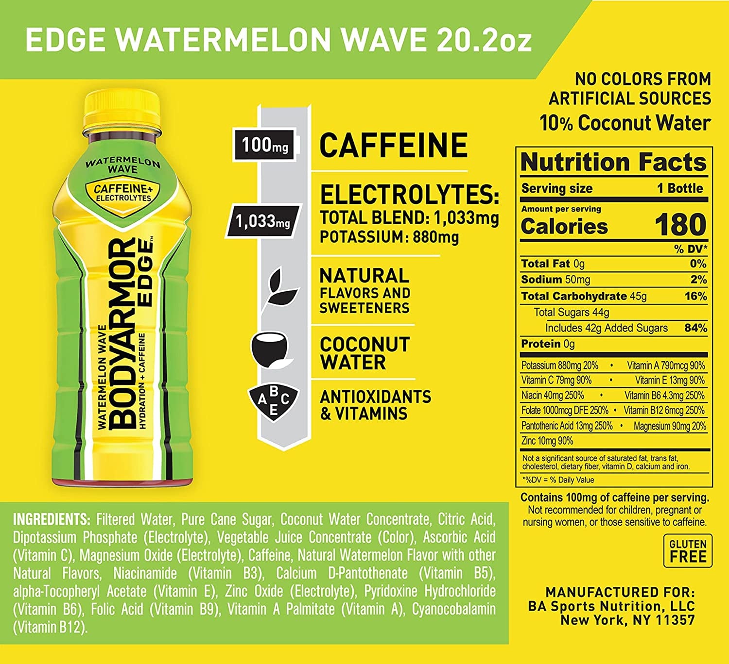BODYARMOR EDGE Sports Drink with Caffeine, Watermelon Wave, Potassium-Packed Electrolytes, Caffeine Boost, Natural Flavors with Vitamins, Perfect for Athletes 20.2 Fl Oz (Pack of 12) is backordered and will ship as soon as it is back in stock.