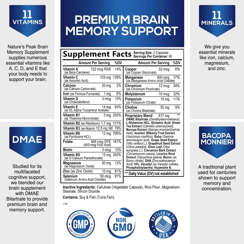 - Nature's Peak Brain Memory Supplement is a carefully curated and scientifically designed set of herbs, vitamins, minerals, and other natural compounds designed to support brain memory, focus, and concentration.