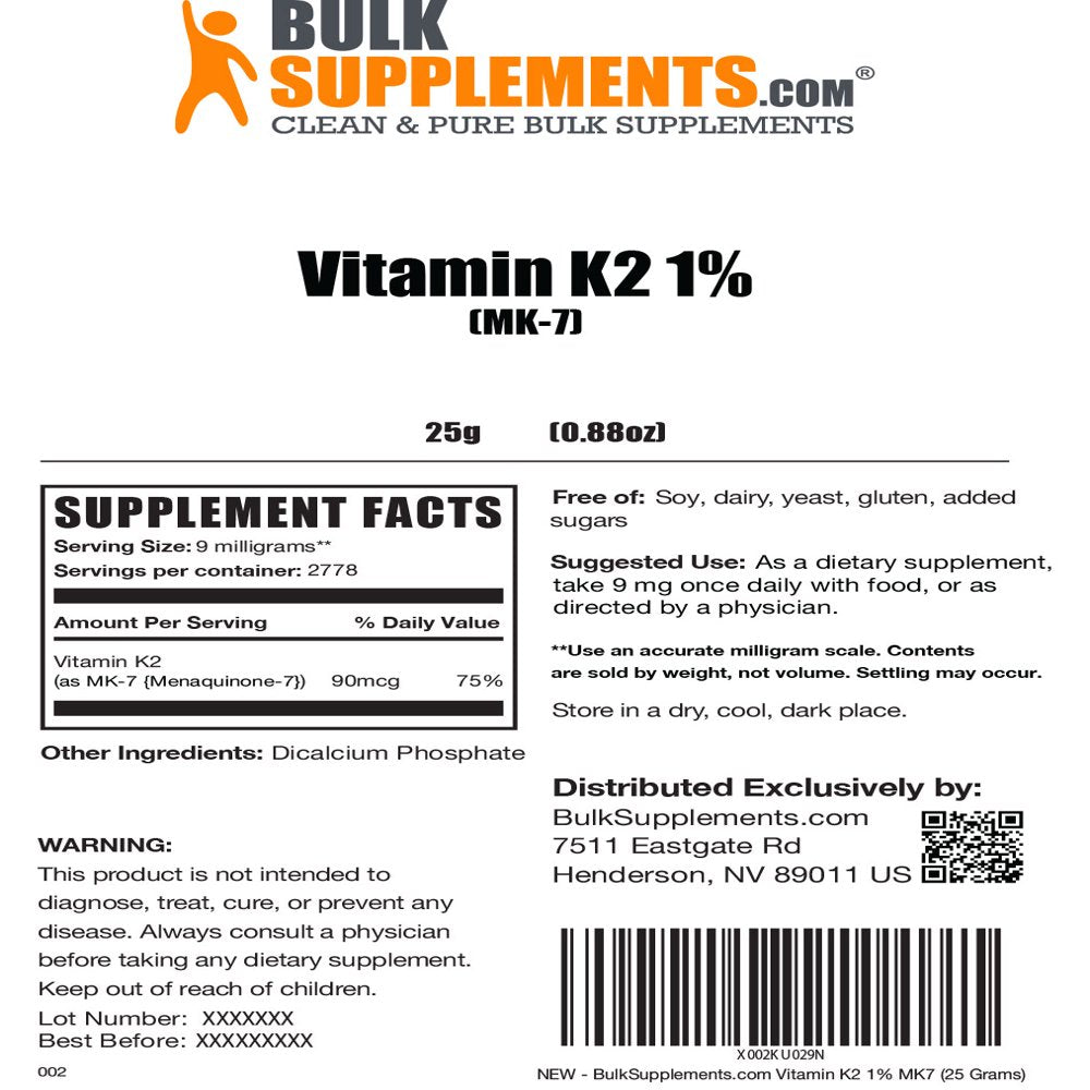 Bulksupplements.Com Vitamin K2 MK7 - Vitamin K2 Supplement - Heart Vitamins - Vitamin K2 Soy Free (25 Grams)