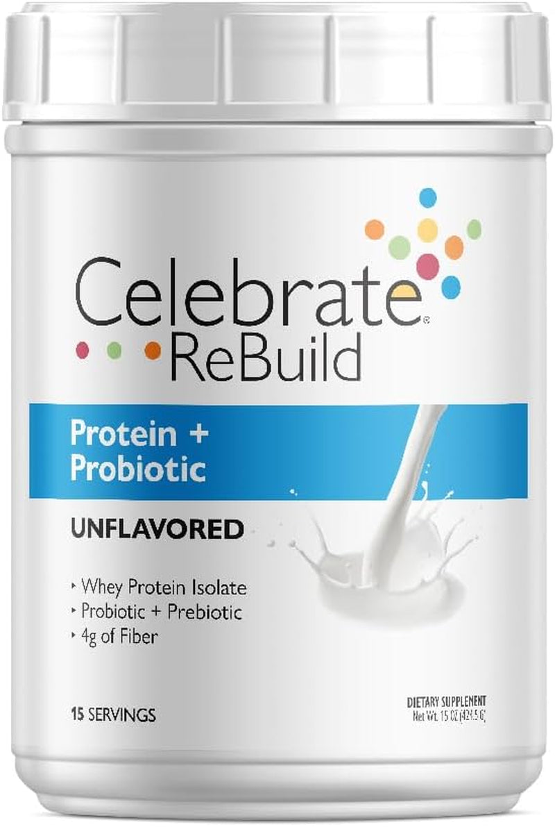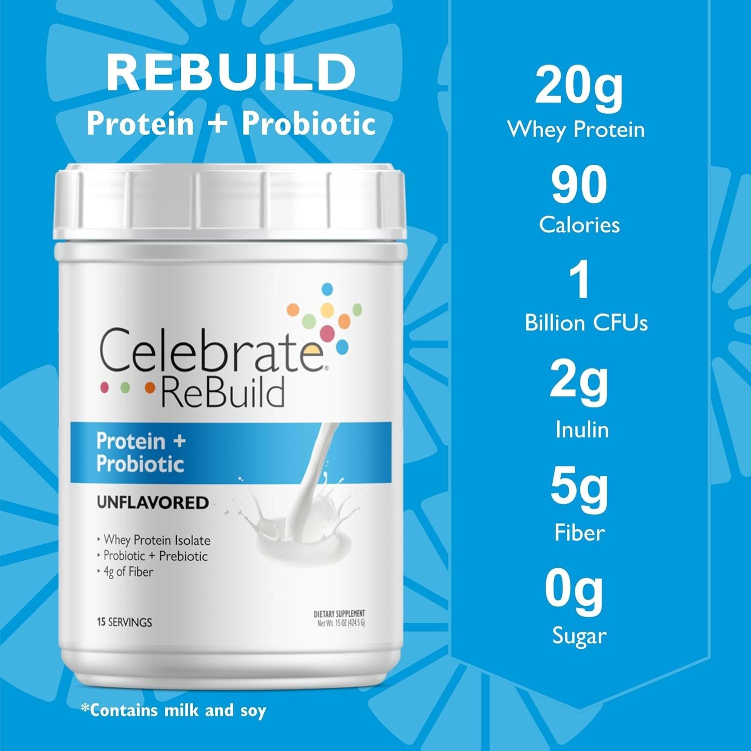 Celebrate Vitamins Rebuild Bariatric Whey Isolate Protein Powder with Probiotic and Prebiotic, 20 G Protein, Gluten Free, Unflavored, 15 Servings
