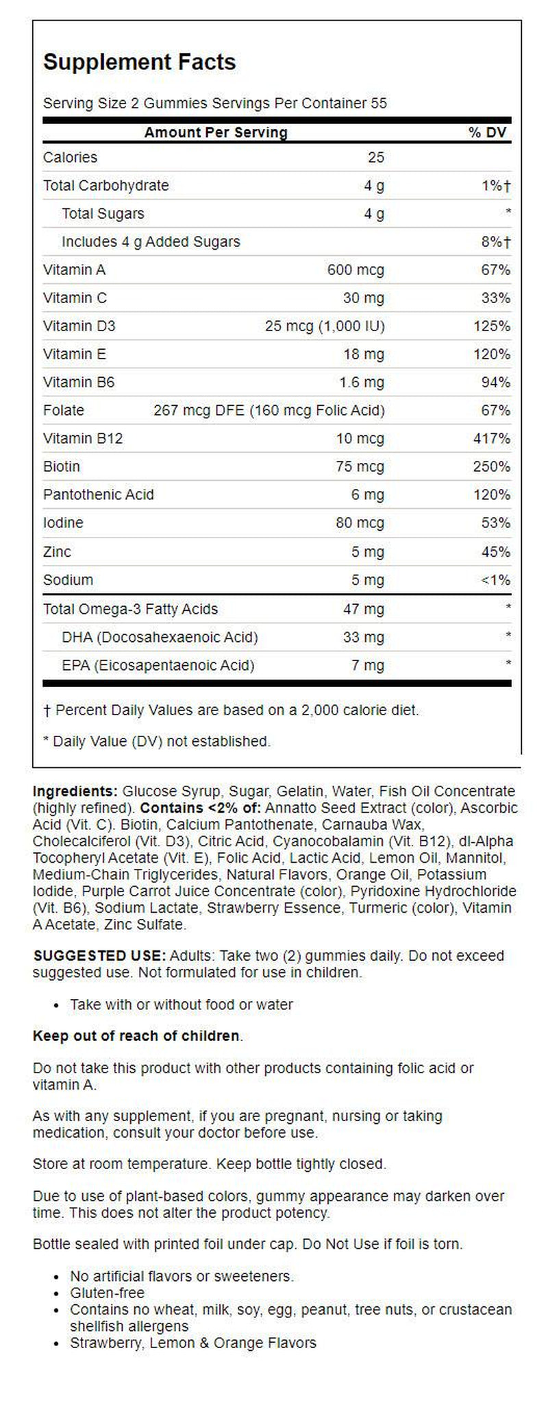 Give your body what it wants, all in one convenient bottle, with Centrum MultiGummies Multi+ Omega 3 Adult Multivitamin. Each multivitamin gummy is formulated with 11 essential nutrients to support overall wellness—including B-Vitamins, vitamin D and antioxidants (7). Centrum Multi+ Omega 3 multivitamin supports heart health (1)(2), normal brain function (3), eye health (4), daily energy needs (5) and normal immune function (6)(7). Each of these multivitamin gummies also contains an added boost of omega-3 fatty acid, with 7 mg EPA and 33 mg DHA. These great-tasting multivitamin gummies are gluten-free with no artificial flavors or sweeteners. Centrum multivitamin gummies come in three delicious fruit flavors: strawberry, lemon and orange. Just chew two gummy multivitamins daily with or without food. Centrum Multi+ Omega 3 Gummy Adult Multivitamins come in a bottle of 110 gummies to keep you stocked for over 50 days. As the number 1 doctor and pharmacist-recommended multivitamin brand, Centrum is backed by over 40 years of nutritional science and is the most clinically studied multivitamin brand in the world. (1) Not a replacement for cholesterol-lowering drugs (2) B-Vitamins help support heart health (7) (3) Zinc and B-Vitamins help support normal brain function (7) (4) Vitamins A, C, and E help support healthy eyes (7) (5) B-Vitamins support daily energy needs (7) (6) Vitamins C and E and zinc support normal immune function (7) (7) This statement has not been evaluated by the Food and Drug Administration. This product is not intended to diagnose, treat, cure, or prevent any disease.