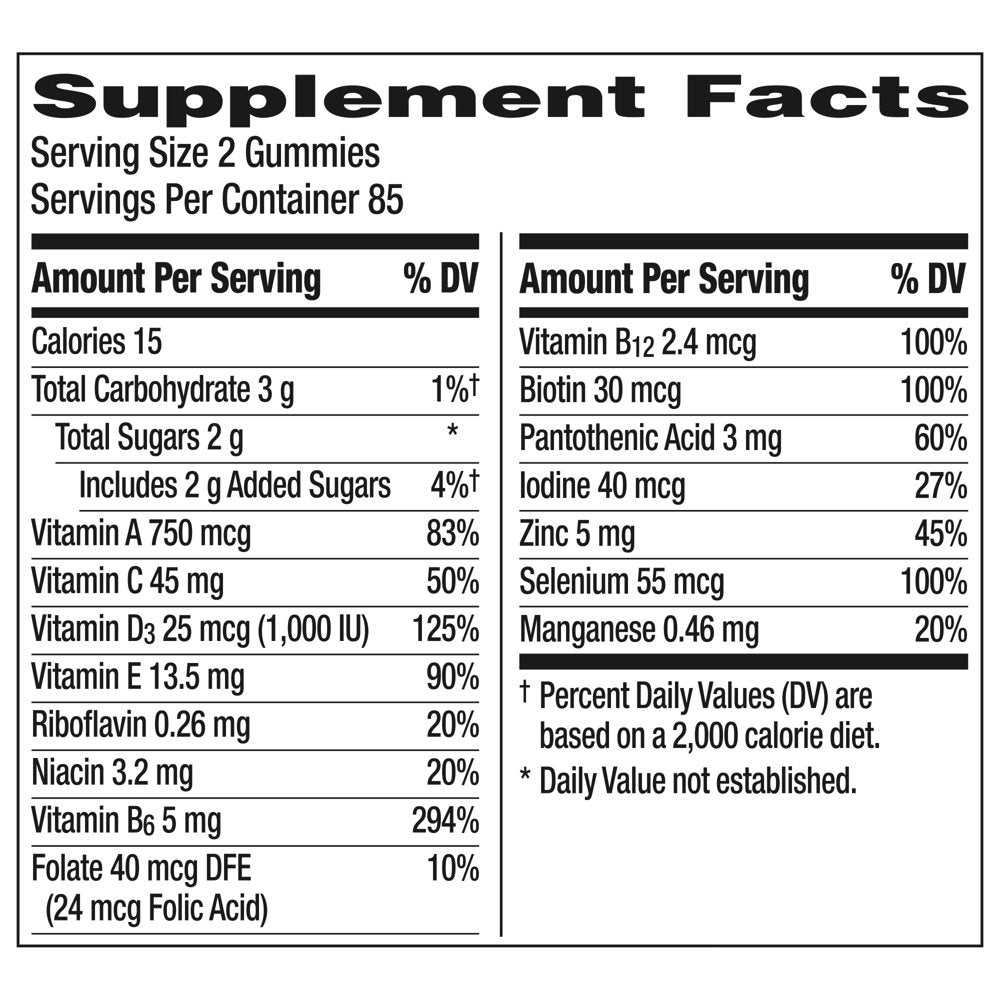 Centrum MultiGummies Men's Multivitamin Gummies are a great-tasting multivitamin/multimineral supplement specially formulated to provide daily essential nutrients that support men's overall health, containing more vitamin D than any other gummy. With 100% of the recommended value for vitamin D, B12, B6 and selenium, these gummy multivitamins for men feed your cells with energy supplements to support your daily needs, as well as muscle supplements to help support muscle function. Each daily multivitamin gummy also contains antioxidant vitamins C, E and zinc for immune support, and metabolism vitamins to help your body process fats, carbohydrates and proteins effectively. Made with natural cherry, berry and apple flavors, these vitamin gummies for men contain no artificial sweeteners and provide a delicious, easy-to-take way to support your body head to toe. Take two of these men's vitamin supplement gummies every day. Feed your cells, fuel your life with Centrum, the #1 doctor and pharmacist recommended brand.