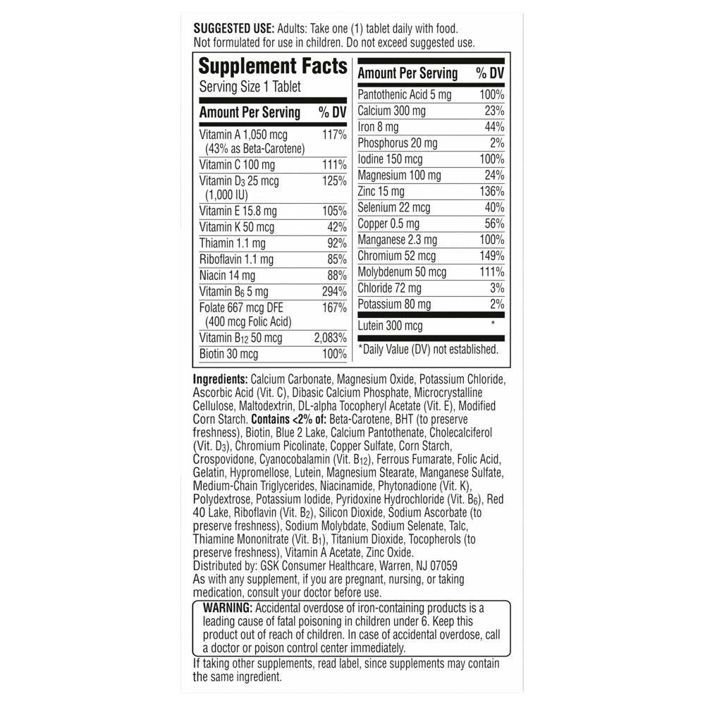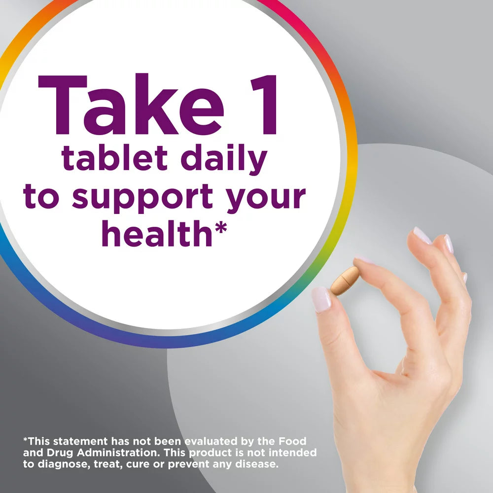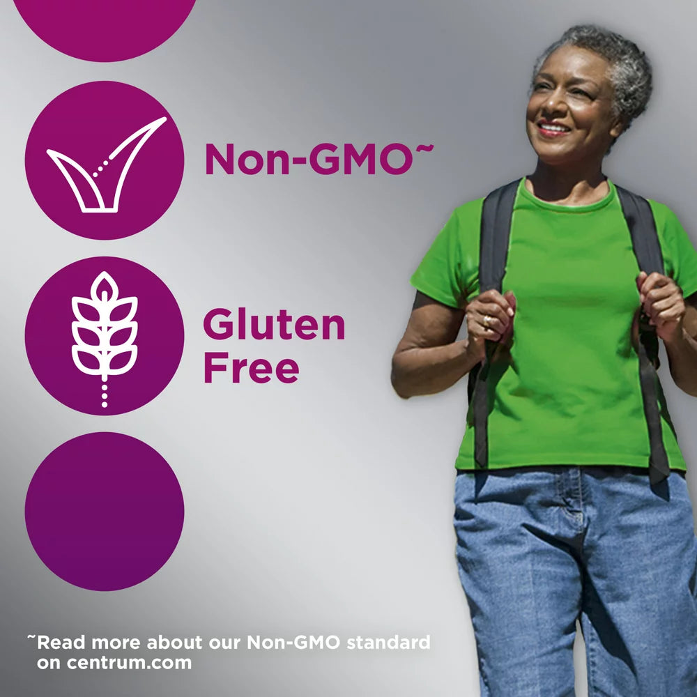 Centrum Silver Women's Multivitamin for Women Over 50 brings you a tailored multivitamin/multimineral supplement that contains micronutrients to help support full body wellness (1). This women's vitamin with iron contains essential nutrients, including vitamin D and calcium to support strong bones and B Vitamins to help promote heart health (1, 2). This multivitamin for women over 50 also contains zinc and B Vitamins to help support normal brain function and Vitamins A, C, and E for eye health (1, 2). Key micronutrients in these multivitamins for women over 50 with zinc supplements help fill in nutritional gaps to promote overall wellness and vitality (1). These women's vitamins with iron are verified Non-GMO (3) and gluten free. These women's multivitamin tablets with iron feature a smooth coating that makes it easy to swallow. Simply take one bone health vitamin daily to provide your body with essential vitamins and minerals. Help support full body wellness (1) with Centrum, the number 1 doctor and pharmacist recommended brand.