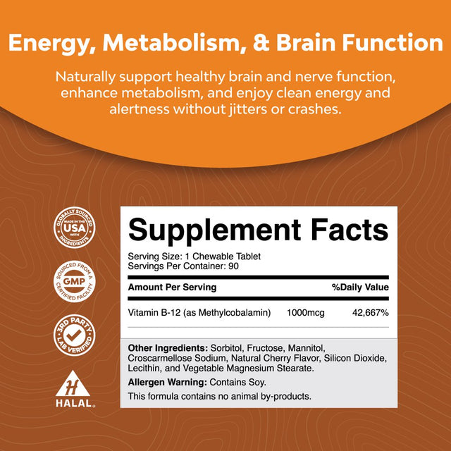 Chewable Vitamin B12 1000 Mcg per Serving - Cherry Flavor Methyl B12 Vitamins for Brain Support, Energy & Metabolism Boost 90Ct Tablets