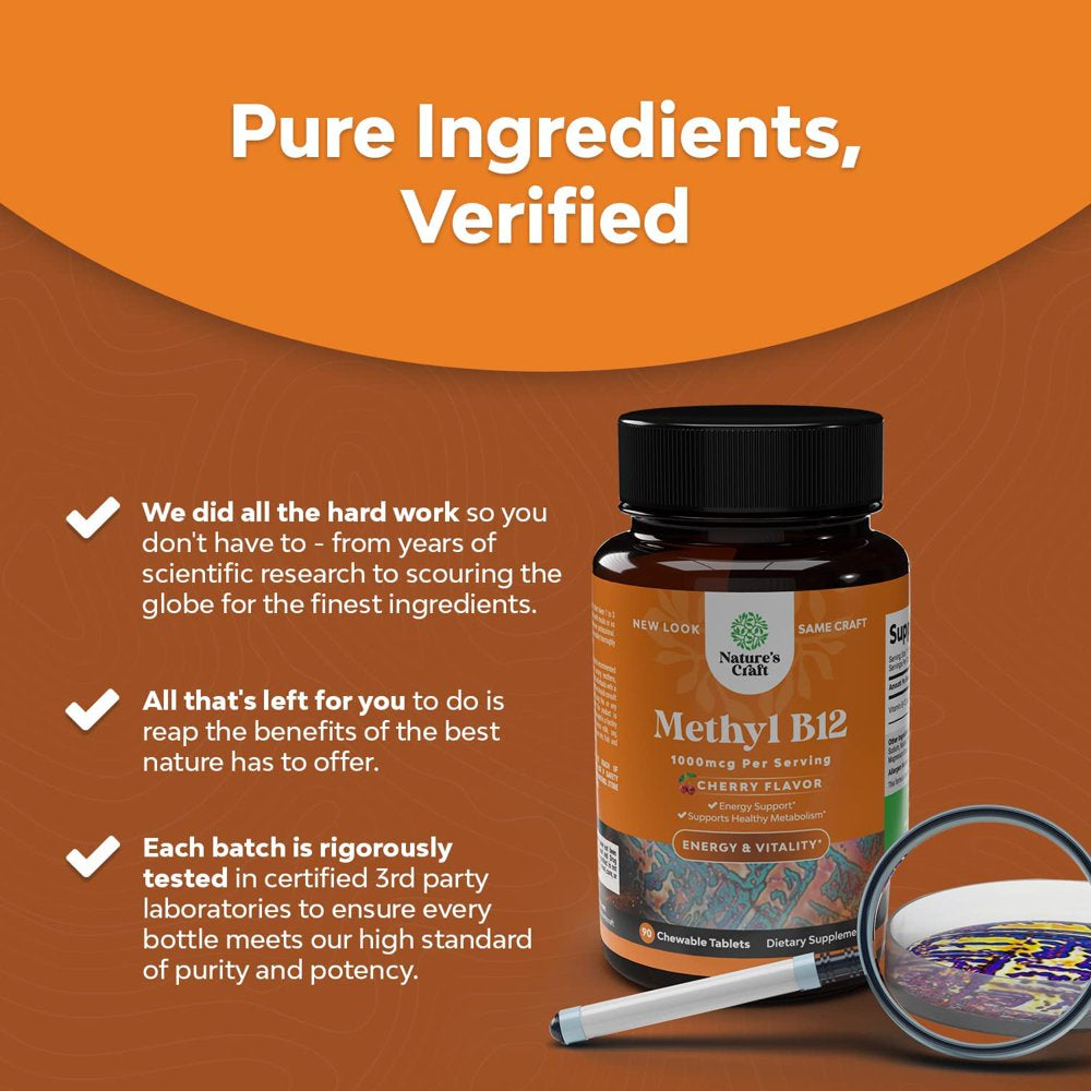 Vitamin B-12 has been proved time and again to possess countless health benefits that can help young and old alike feel and look their best. The anti aging properties of B12 promote healthier looking and feeling hair, skin, and nails from the molecular level. Furthermore, low levels of vitamin B12 can even lead to hyperpigmentation issues as well as nail discoloration and other skin issues. Simply adding vitamin B12 can drastically help you maintain your best skin hair and nails without any harsh treatments. Besides for looking your best, many people choose vitamin B-12 to feel their best, especially when it comes to their energy levels. Unlike energy drinks and coffee, there is no crash with vitamins and B12 can help you naturally battle fatigue. Those struggling with memory, focus, and mental clarity can also benefit from taking our vitamin B12 supplement. B12 has many anti aging properties which target the brain and have been shown to help slow down cognitive decline, especially as a result of aging. Looking to feel more like yourself? Vitamin B12 can improve your mood and help you feel more interested in your daily activities. In fact, research has shown that there is a significant correlation between B12 deficiencies and mood conditions. Remember: At Nature’s Craft, we use only the purest, most potent and high-quality ingredients available in our Vegan B12 Vitamin supplement. We do this because we want our products to work for you time and again. We want you to be a customer for life!