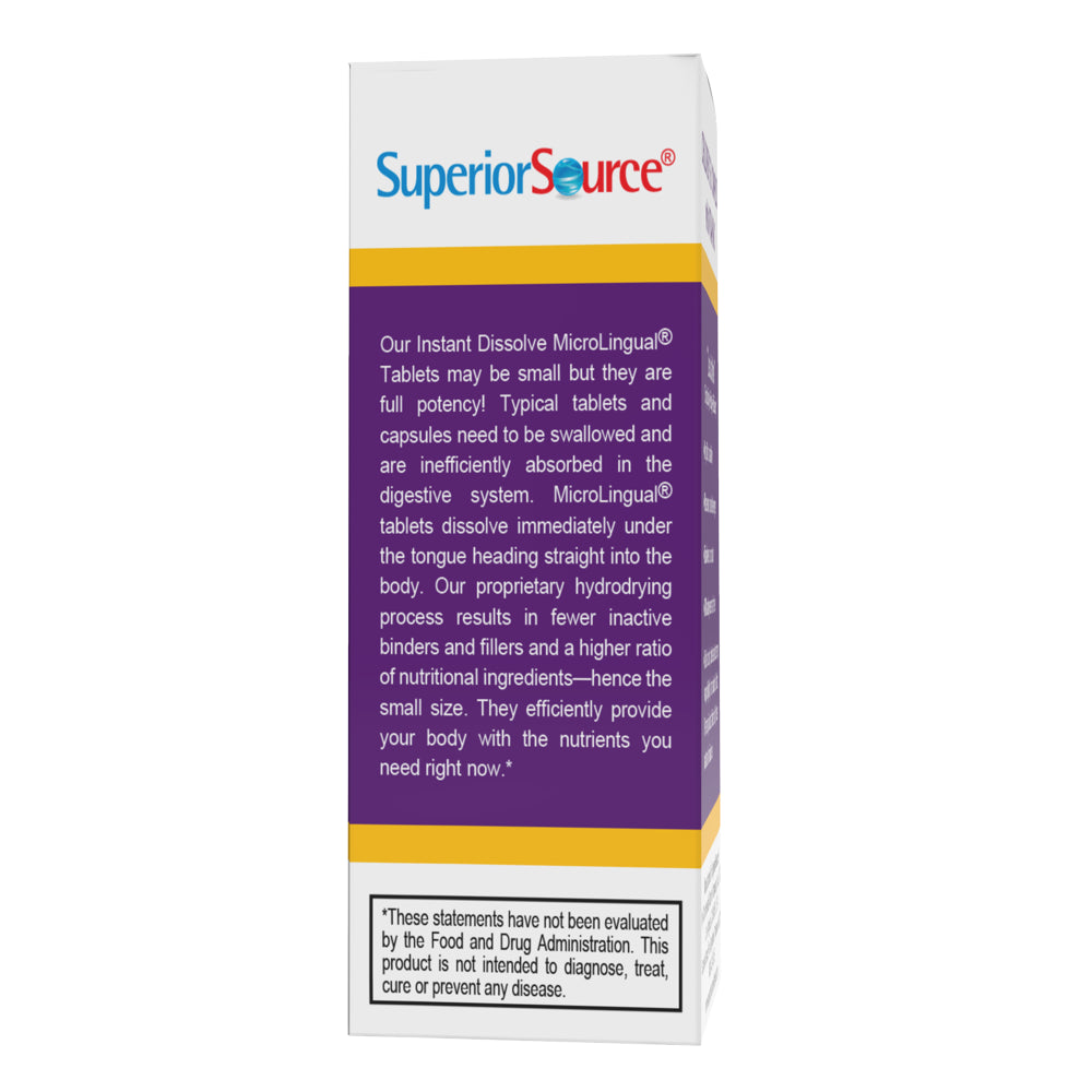 - · MICROLINGUAL VITAMINS – Melts that dissolve instantly with no pills to swallow. Superior Source pioneered the world's best delivery system of sublingual vitamins that melt fast under the tongue and give maximum absorption for the body.