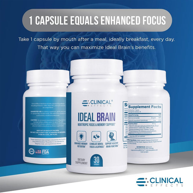 Clinical Effects Ideal Brain - Dietary Supplement for Nootropic Focus and Memory Support - 30 Capsules - B Vitamins, GABA, Alpha-Gpc - Helps Support Mental Focus, and Optimal Brain Function
