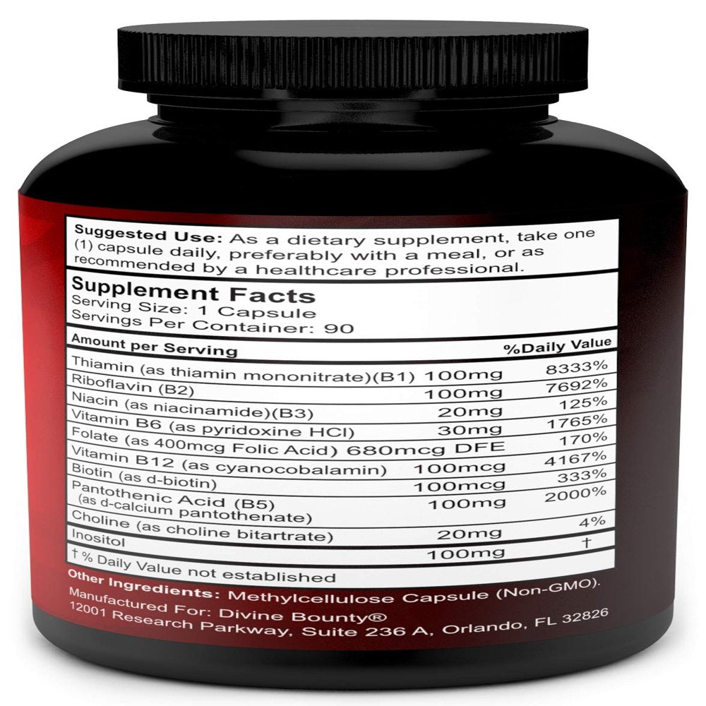Divine Bounty Super B Complex Vitamins - All B Vitamins Including B12, B1, B2, B3, B5, B6, B7, B9, Folic Acid - Vitamin B Supplement - Support Healthy Energy Metabolism - 90 Vegetarian Capsules