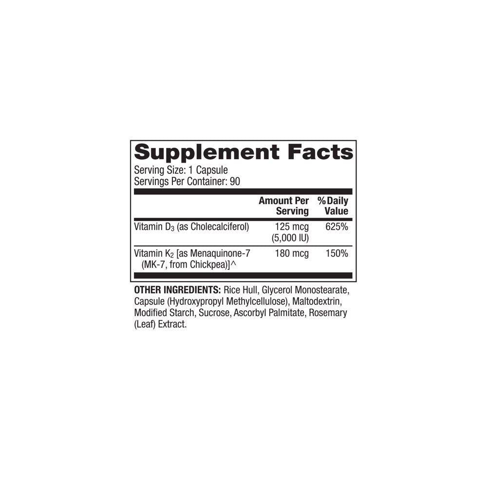 - Vitamin K2 is utilized from fermented chickpeas in its patented and clinically supported form MK-7 (MenaQ7), which helps maintain bone density and strength supports optimum calcium absorption and utilization.