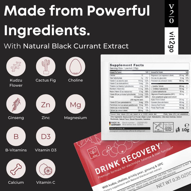 • 🇩🇪 100% MADE IN GERMANY! Vit2go DRINK RECOVERY is 100% made in Germany and produced by a certified manufacturer. All Vit2go supplements are vegan-friendly!