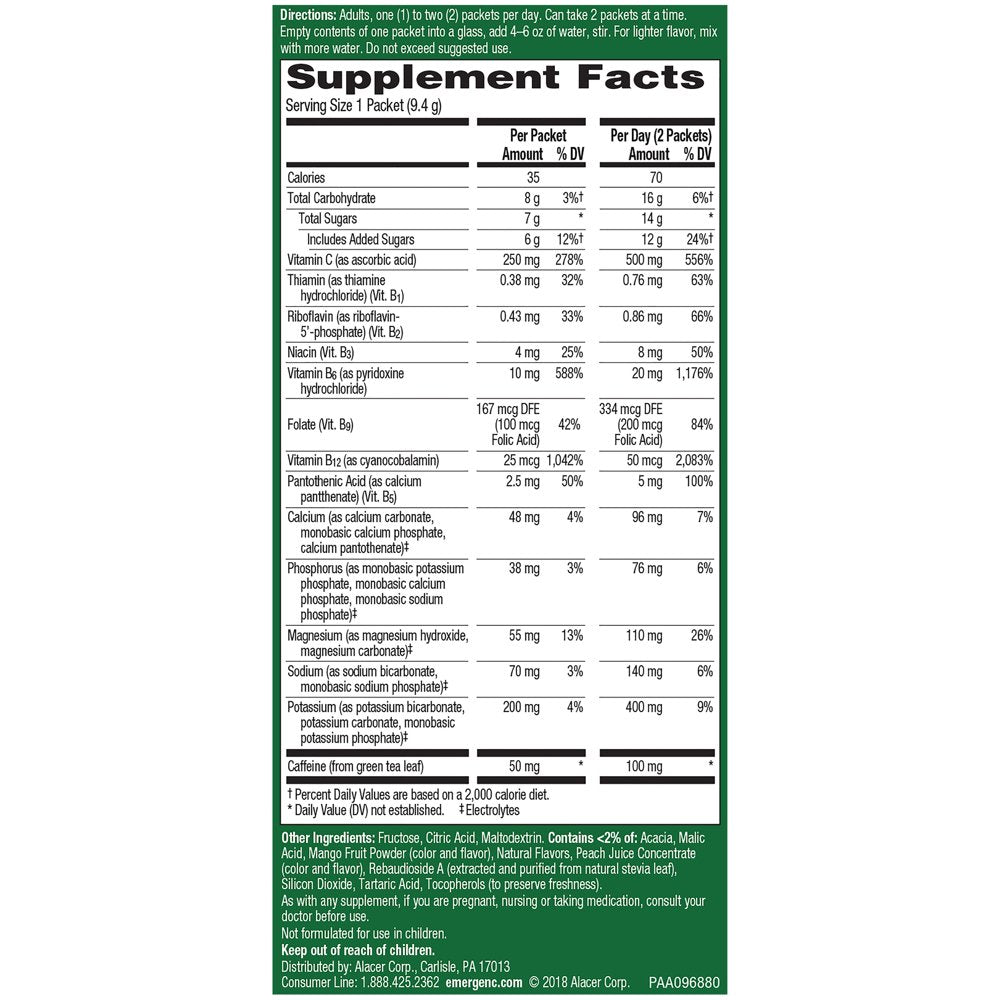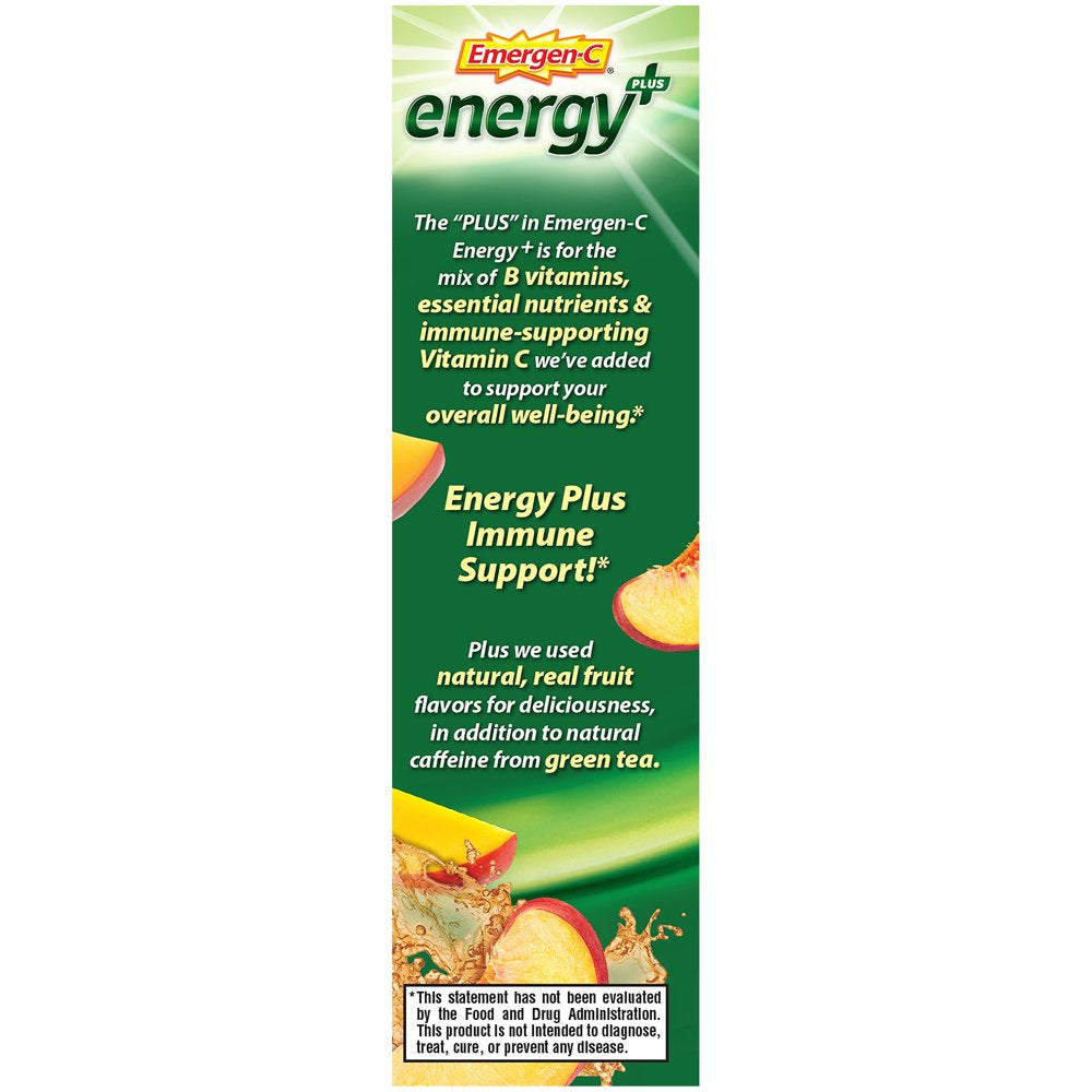 - Each box contains 8,( 0.33-ounce) packets of Emergen-C Energy+ Mango Peach flavor with other natural flavors