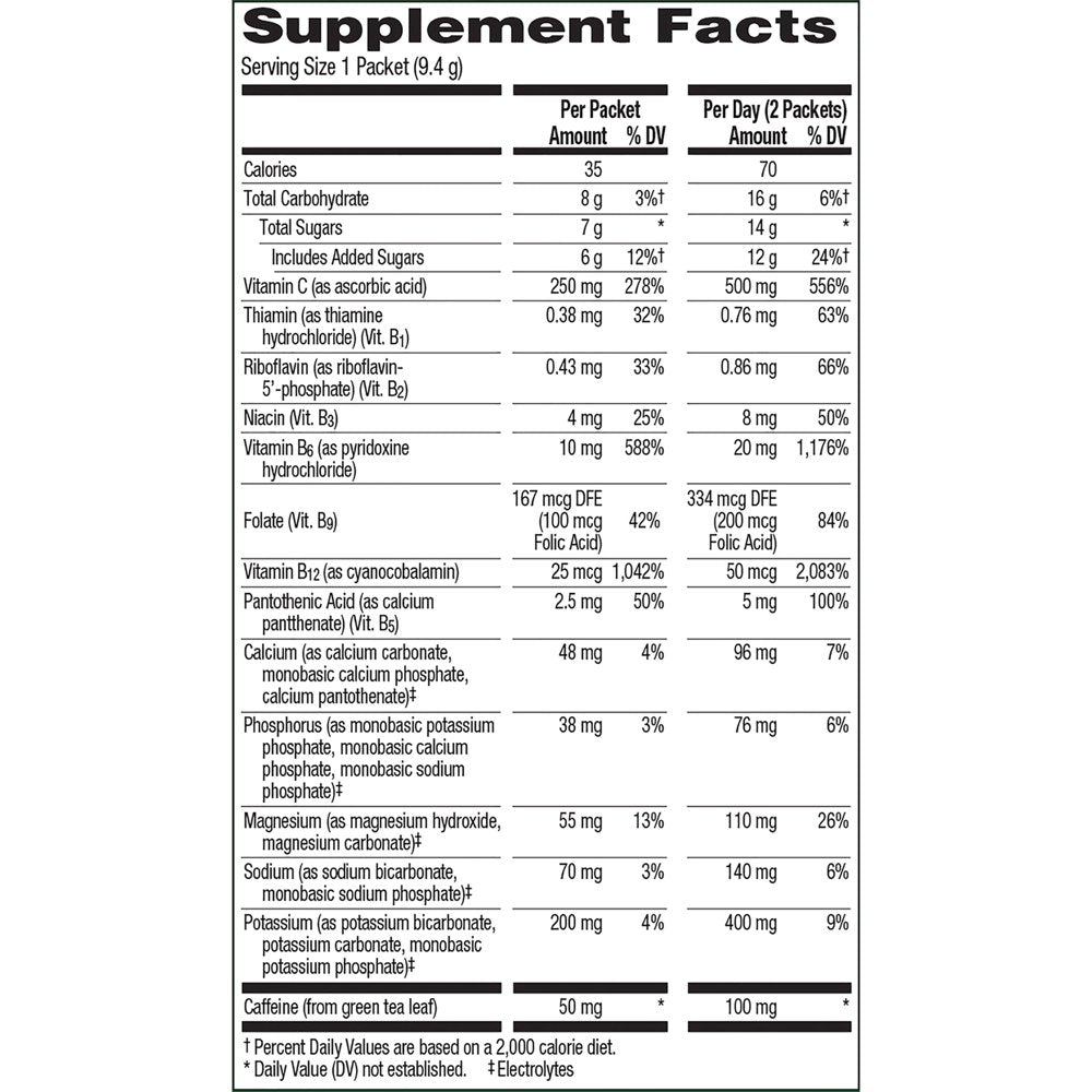 Find energy support in each packet of Emergen-C Energy+, formulated with natural caffeine from green tea* plus immune-supporting Vitamin C to fortify you, and 7 B Vitamins to replenish your body*. Emergen-C Energy+ energy drink mix is bursting with natural, real fruit flavors for a tasty sip every time. Energy powder can be paired up with your favorite Emergen-C products(1). To make Emergen-C Energy+, simply empty contents into a glass, add 4 to 6 ounces of water, stir and Emerge Energized! Emergen-C Energy+ dietary supplement products are available in powder, energy shots and gummies.(1) excludes Emergen-Zzzz products*These statements have not been evaluated by the Food and Drug Administration. These products are not intended to diagnose, treat, cure or prevent any disease.