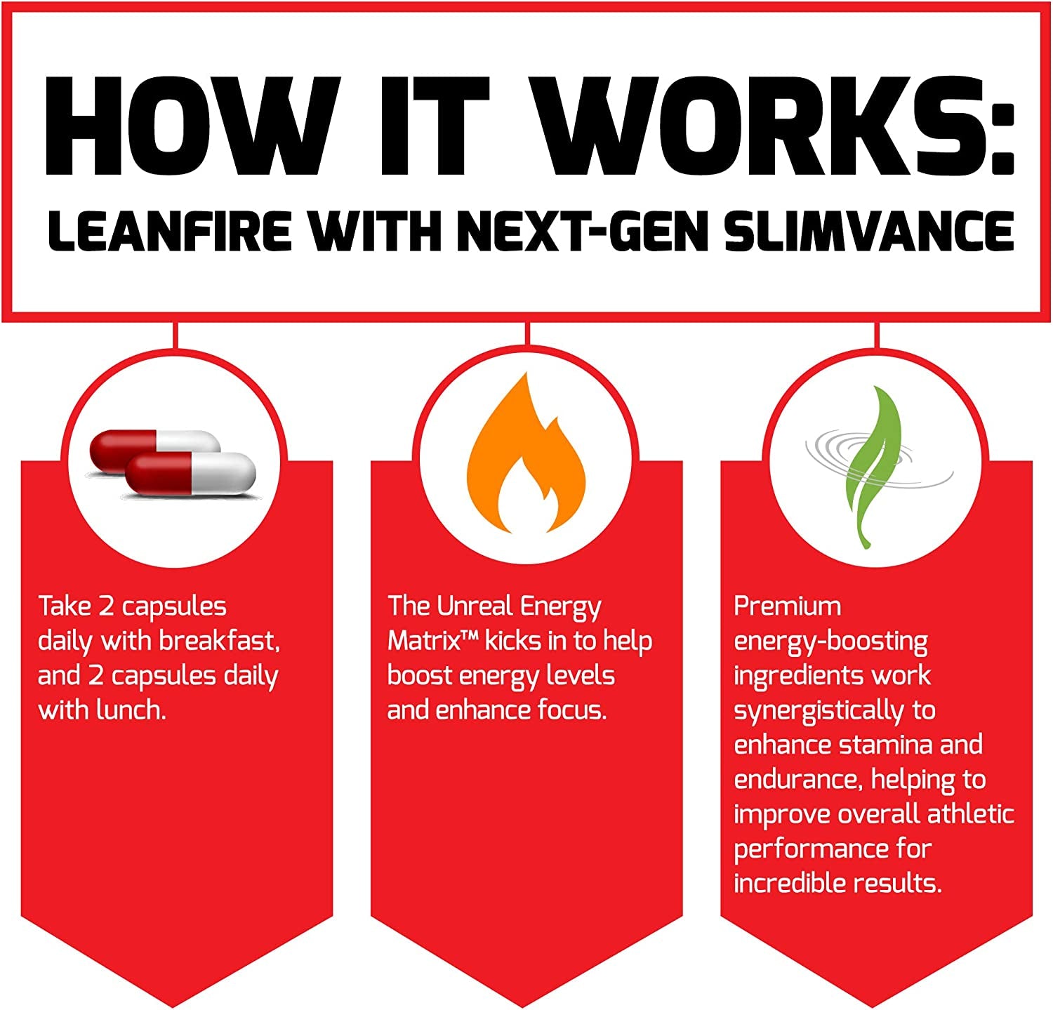 - ENHANCED STAMINA AND ENDURANCE: the branded energy constituents in Leanfire with next-gen slimvance are designed to deliver long-lasting, No-Crash energy that increases stamina and endurance all day long, pushing you to power through that final set.