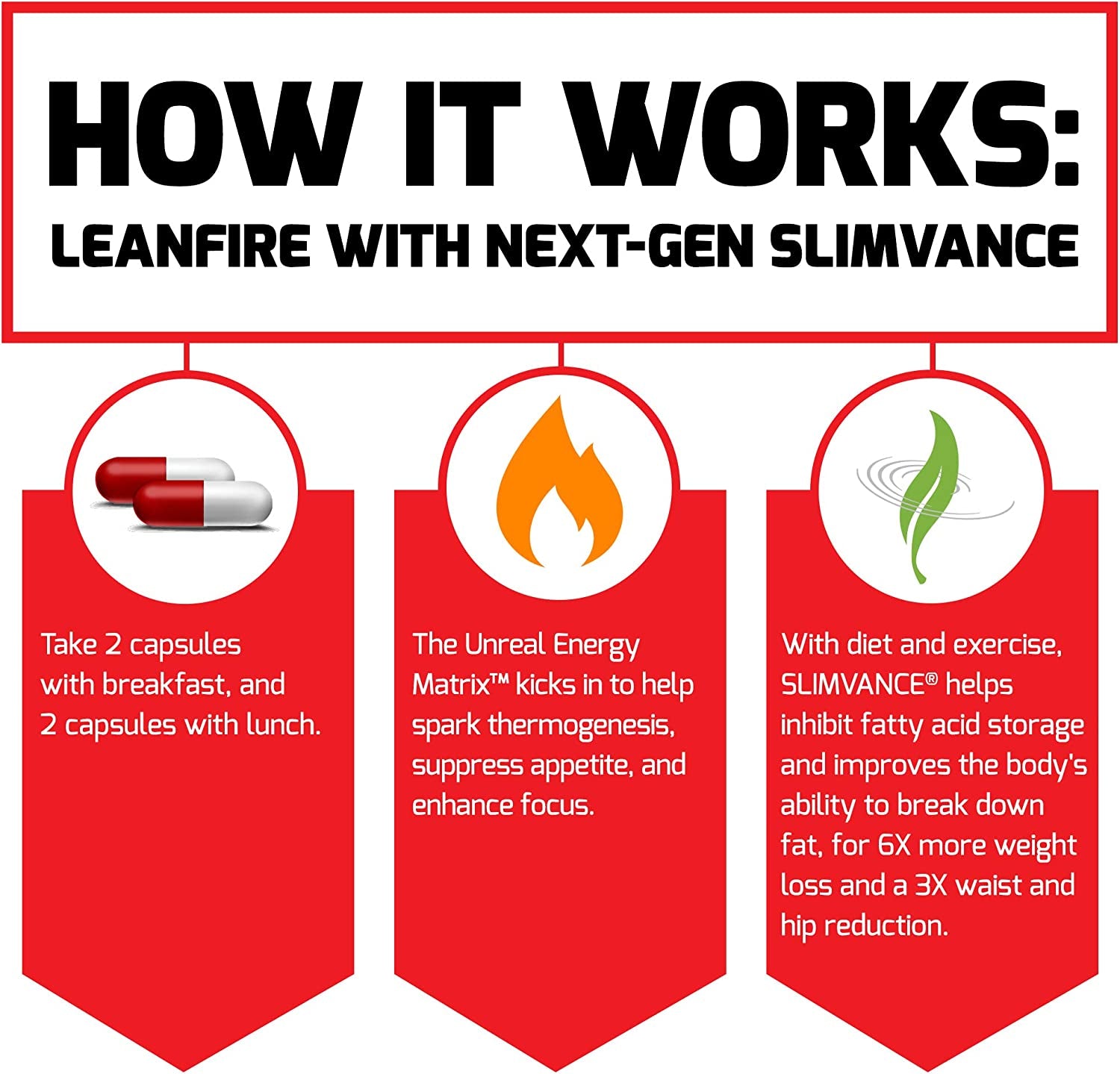 - TRUE WEIGHT LOSS BREAKTHROUGH: For years, diet pills have notoriously produced mixed results, casting doubt on their effectiveness entirely. After nearly 30 years of mediocre formulas, the next generation in weight-loss science has arrived. LeanFire with Next-Gen SLIMVANCE is engineered to deliver comprehensive weight loss results in three phases: restrict fat production, prevent fat storage, and ignite fat oxidation.