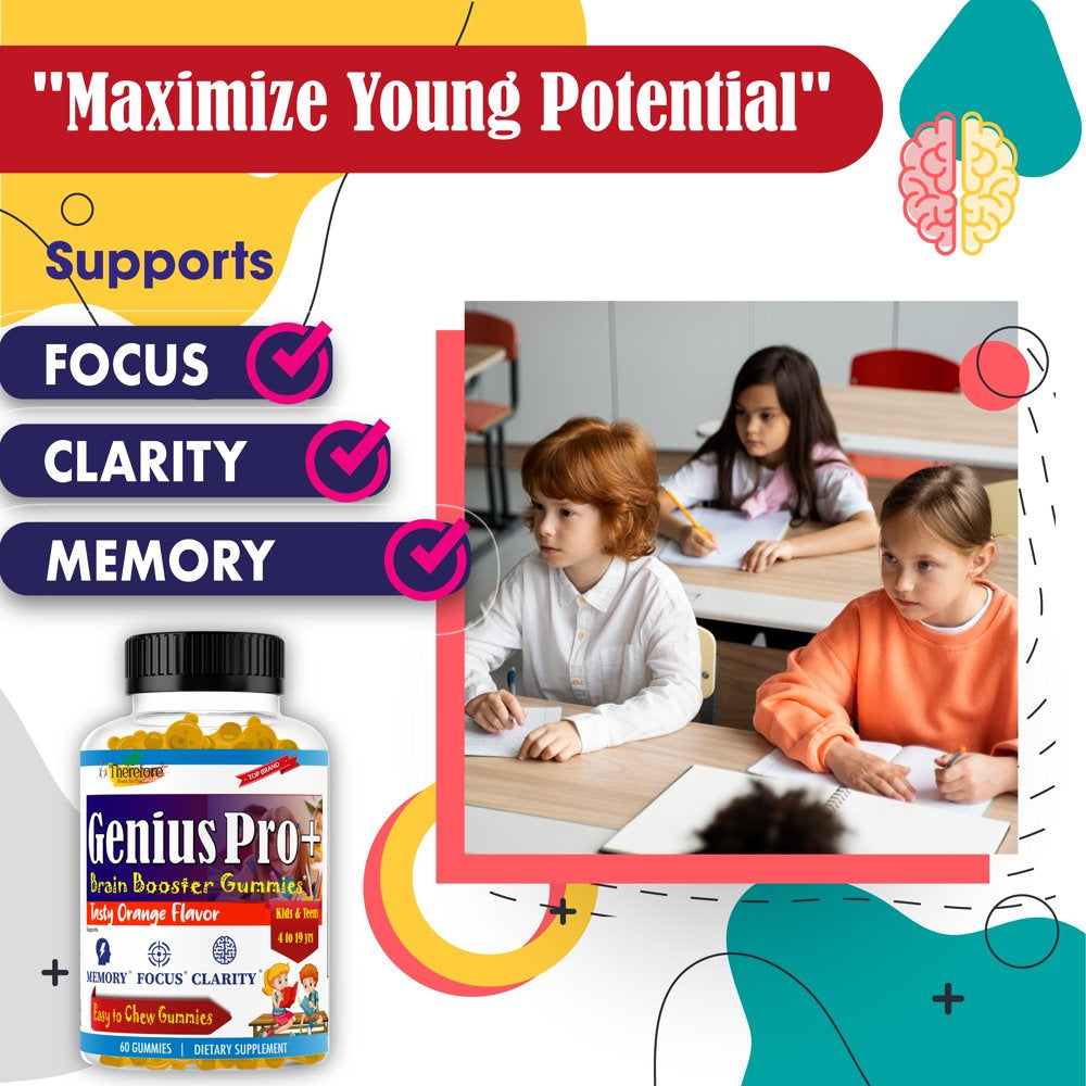 - Kids Focus Brain Supplement: GeniusPro+ kids brain support gummies for kids help support brain health of your child. Effective in elevating focus & attention as well as mood support, helping your child support their learning abilities while staying calm, support in focus, concentration, and brain function in children.
