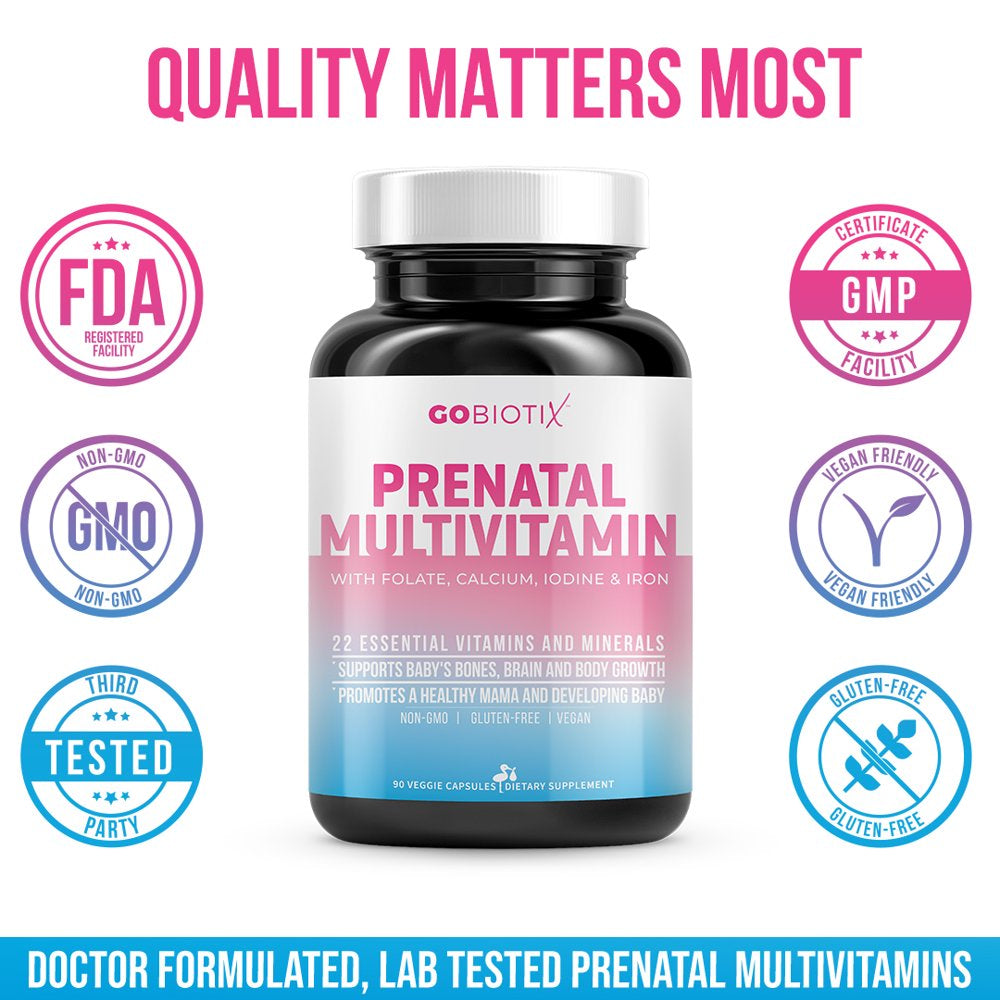 HELPS REDUCE THE CHANCE OF FETAL ABNORMALITIES. GoBiotix Prenatal Multivitamins is specifically engineered for happier, healthier babies. As an expecting mother, we know you want the best for your baby, right? That's why we've packed our daily prenatal with folic acid, iron and calcium. Plus, it's loaded with 22 essential prenatal vitamins, important minerals, and prenatal nutrients your body needs to help support a happy and healthy baby.
