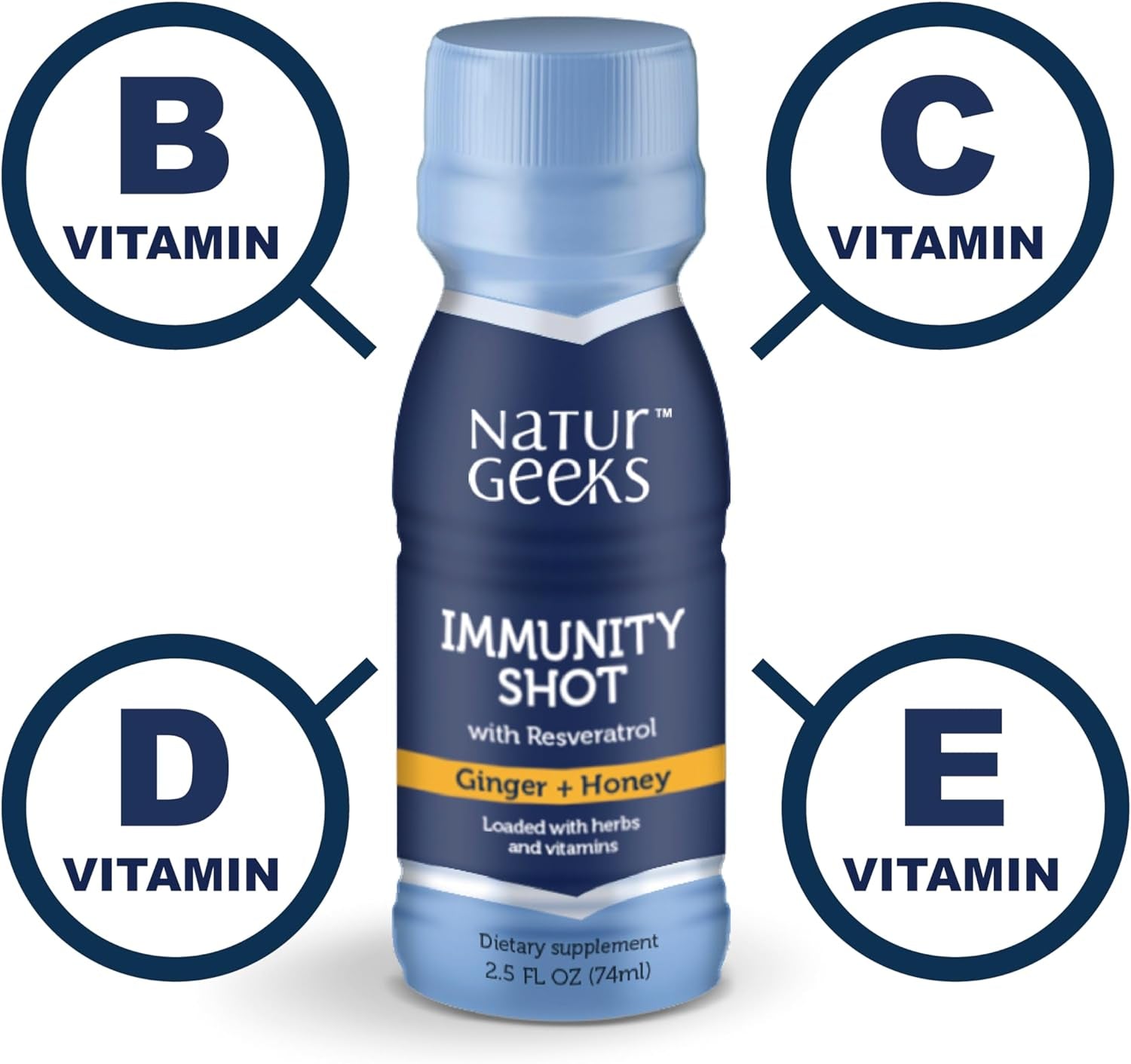 NaturGeeks Immune Support Shots is a proprietary 2.5 oz functional beverage shot explicitly formulated to help support your immune system. This one small bottle is supercharged with unique ingredients, loaded with vitamins, herbal extracts, and spicy ginger flavor, with the sweetness of honey. No need to take multiple daily vitamins, pills, or supplements. It contains natural Resveratrol, Spermidine, and Beta glucan, which are proven by scientific studies to increase the strength of your immune system. In addition, it is packed with a sufficient dose of vitamin C, D, E, B6, B12, and Zinc and is flavored with ginger and sweetened with honey! We made an immune drink so delicious you will crave it! Give your immune system everything it needs in one shot.