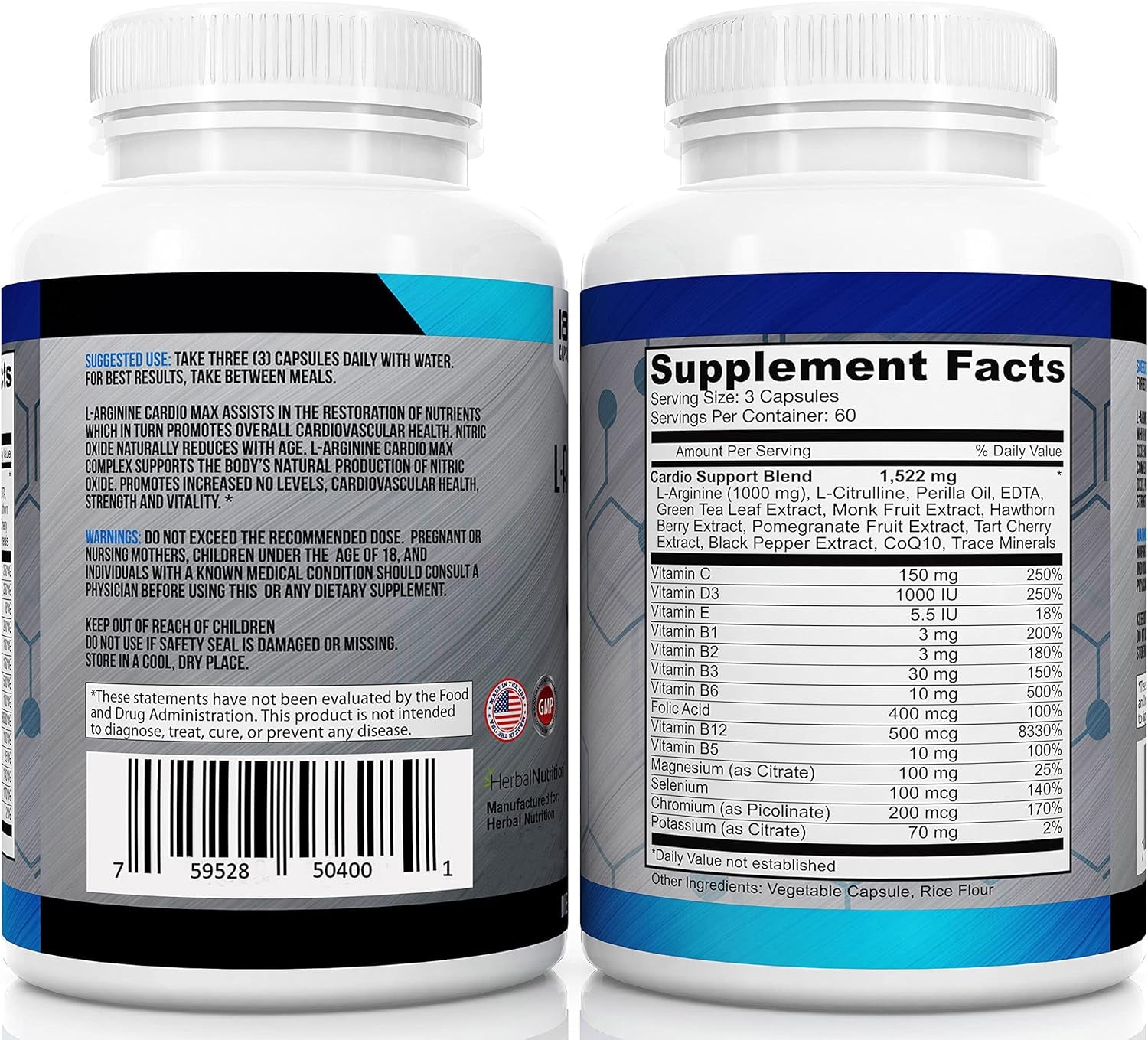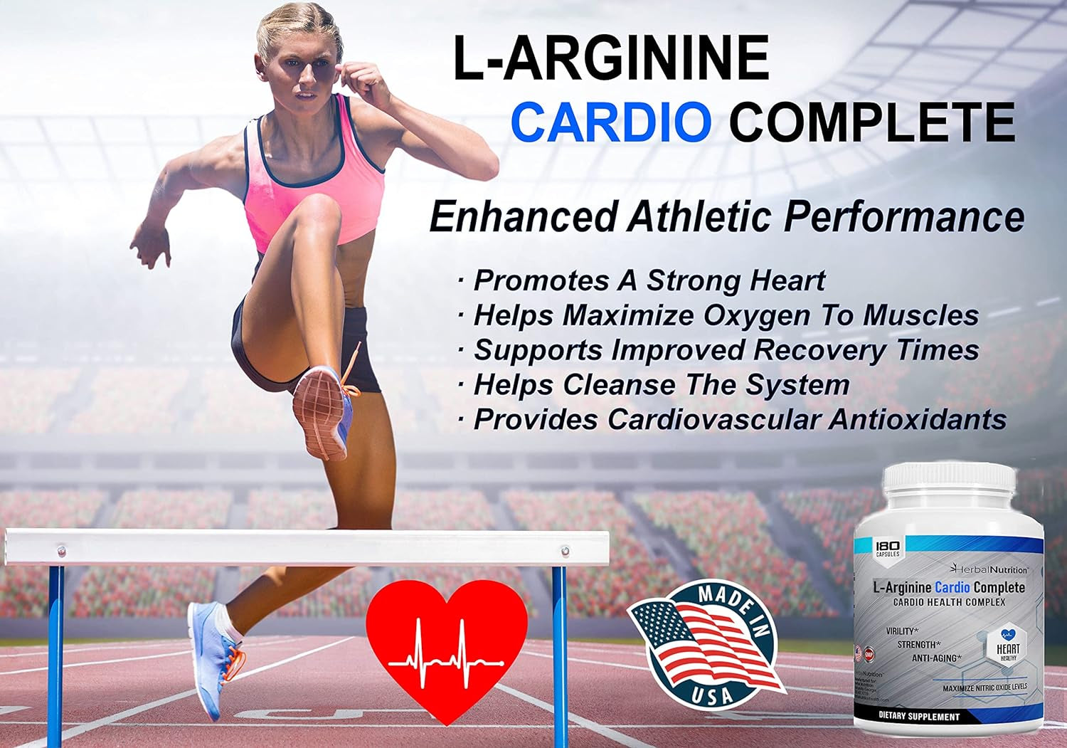 L-Arginine Cardio Complete, Nitric Oxide Booster, 1500Mg Cardio Support Blend plus L-Citrulline, Vitamins Minerals Supports Cardio Health, BP, Energy, Nitric Oxide, One Bottles 180 Caps