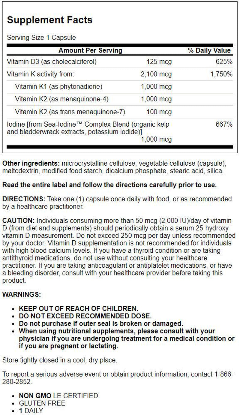 Vitamins D and K with Sea-Iodine(TM) from Life Extension(R) features 125 mcg of vitamin D, 2,100 mcg of vitamin K from phytonadione, menaquinone-4 and menaquinone-7, plus 1,000 mcg of natural iodine from Sea-Iodine(TM) Complex. This complex features organic kelp, bladderwrack extract and potassium iodide.