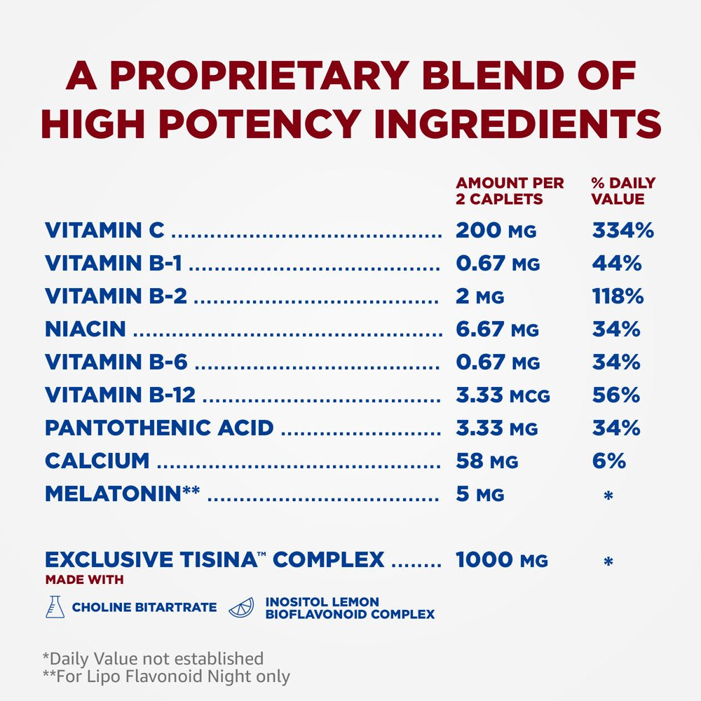 • CONVENIENT DAY/NIGHT KIT: contains 60 caplets of Lipo-Flavonoid Plus for your morning and midday doses and 30 caplets of Lipo-Flavonoid Night, with added melatonin, for your evening dose to help in falling and staying asleep.