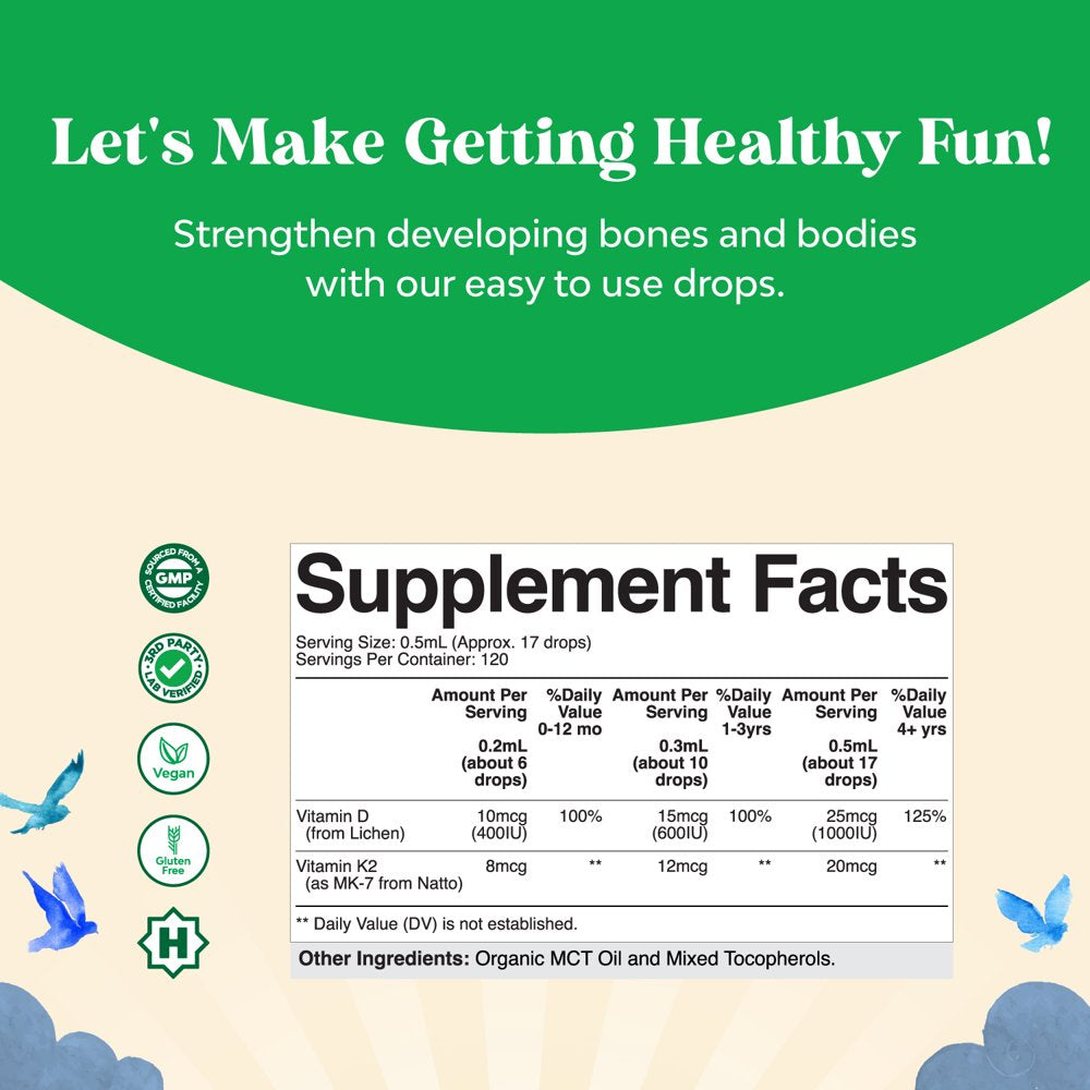 - Liquid Vitamin D3 with K2 - We crafted the ideal organic K2 D3 vitamin supplement for kids with 400IU 600IU or 1000IU servings to ensure your little one is getting the precise nutrients they need
