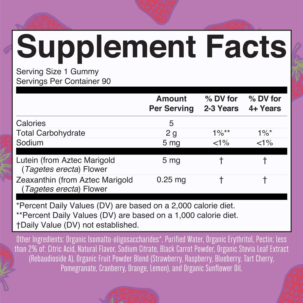 - Vegan Formula: Per Serving (1 Gummy): 5 mg Lutein (from Marigold (Tagetes erecta L.) flower), 0.25 mg Zeaxanthin (from Marigold (Tagetes erecta L.) flower), Organic Isomalto-oligosaccharides, Purified Water, Organic Erythritol, Pectin, Organic Fruit Powder Blend), Natural Strawberry Flavor, Citric Acid, Sodium Citrate, Black Carrot, Organic Vegan Stevia Leaf Extract, Organic Sunflower Oil.