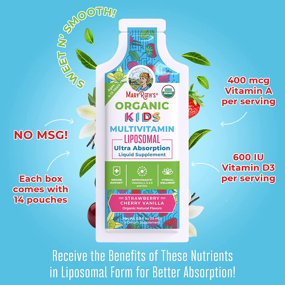 MaryRuth Organics Kids Multivitamin Liposomal: A delicious liquid multivitamin formulated for kids with no added sugar! If you're looking to support nutrient gaps in your child’s diet, our Kids Multivitamin Liposomal is an easy-to-take liquid in a delicious strawberry cherry vanilla flavor with zero added sugar that'll make kids enjoy taking their vitamins! This package contains 14 pouches. Each pouch contains 0.5 fl oz. Unisex.