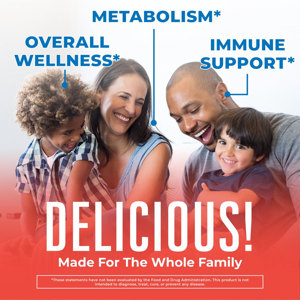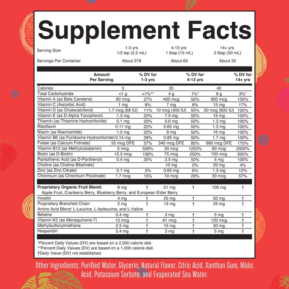 Support your body’s nutrient needs, all with no hard to swallow pills. This easy-to-take morning multivitamin is formulated to support your body’s metabolism, immune system & overall health. Vitamin C is an essential antioxidant and a cofactor in the synthesis of collagen protein, vital for the health and structure of multiple parts of the body including muscles, bones, and skin! Vitamin D3, the same type of vitamin D that your body naturally produces when exposed to sunlight, supports immune functions and bone health, while vitamin E also helps maintain your immune system. Bioactive K2 (Menaquinone-7) is beneficial for strong bones, helping calcium bind into the bone matrix. K2 also supports heart health by maintaining a healthy vascular system. This formula contains a blend of B Vitamins, which are essential for metabolic processes as well as support of the nervous and circulatory systems. Choose from delicious Strawberry or Fruit Punch flavors!